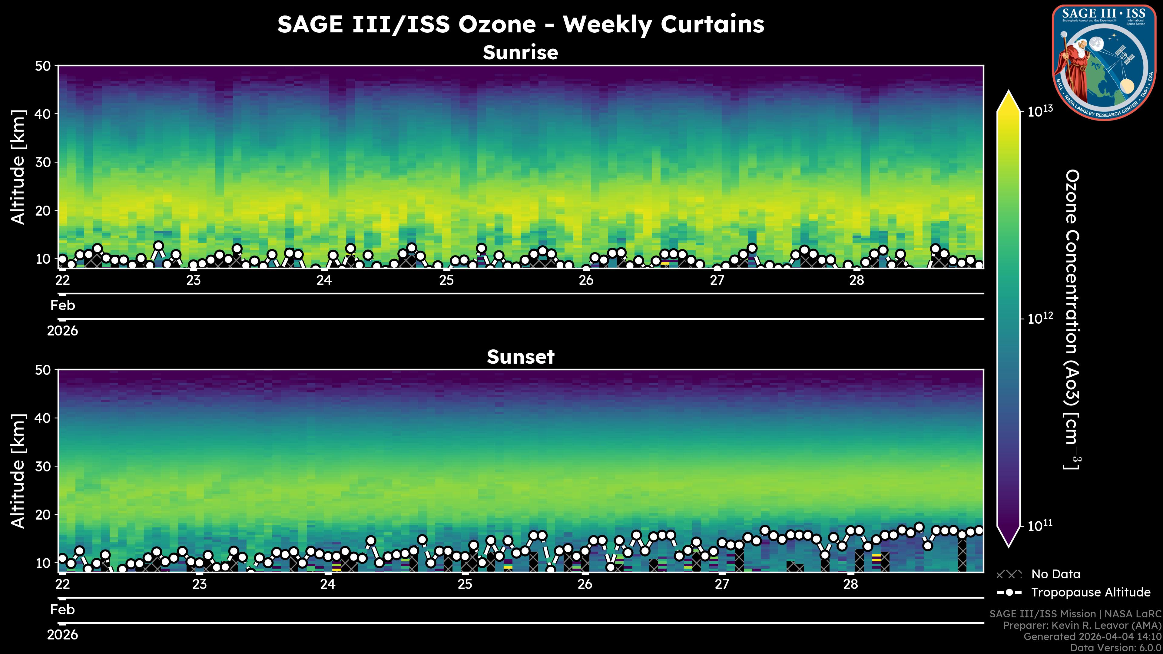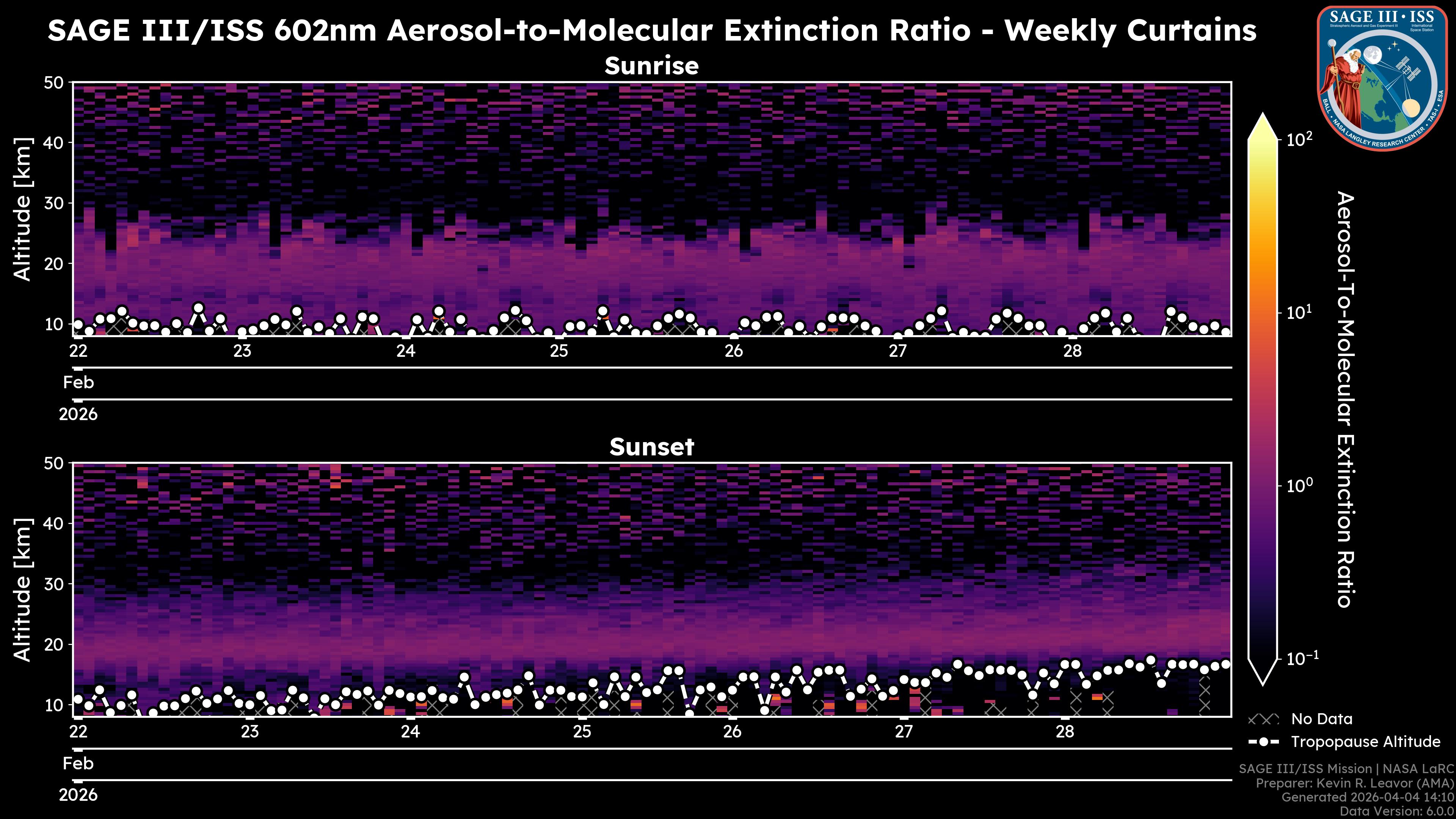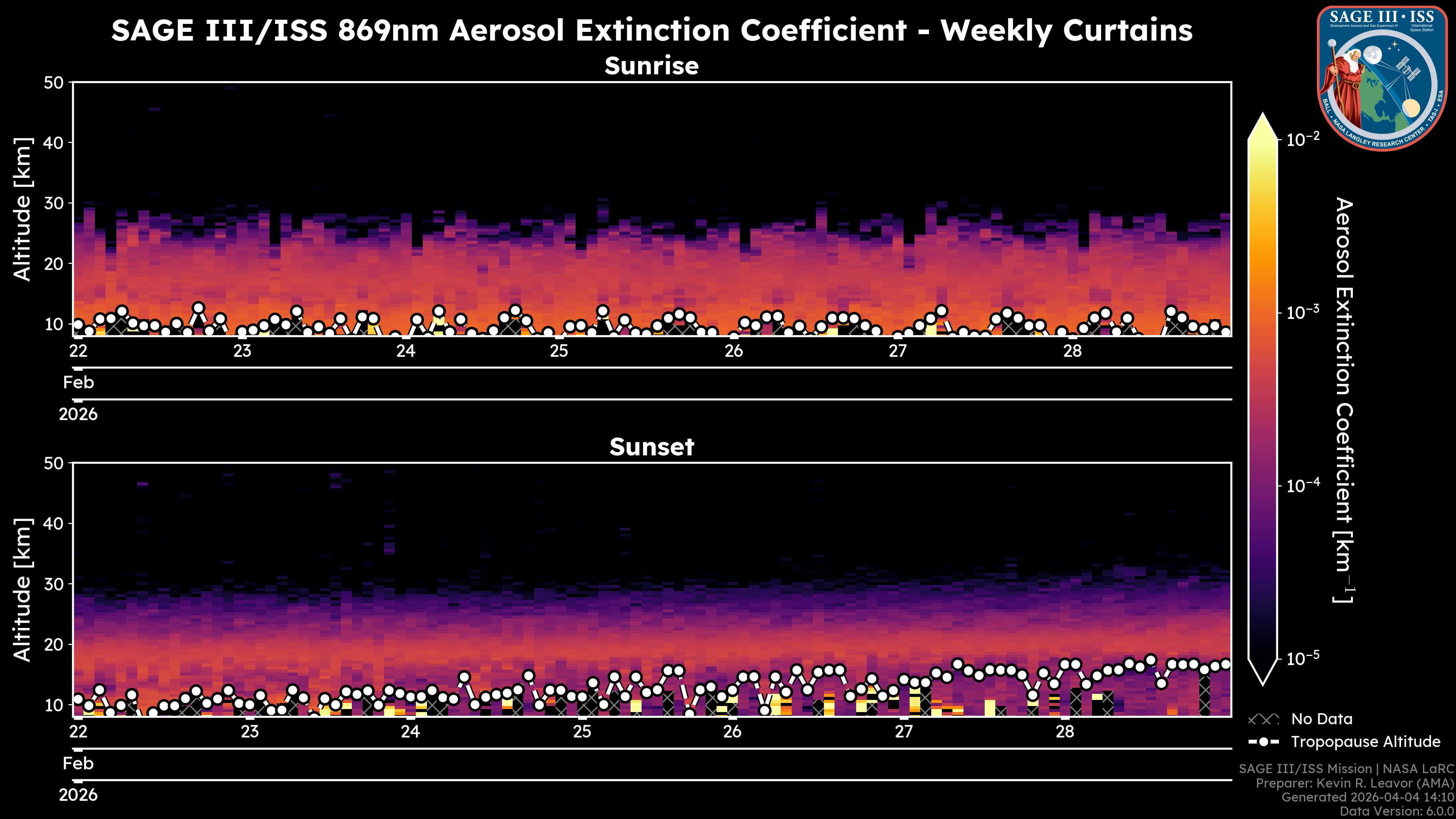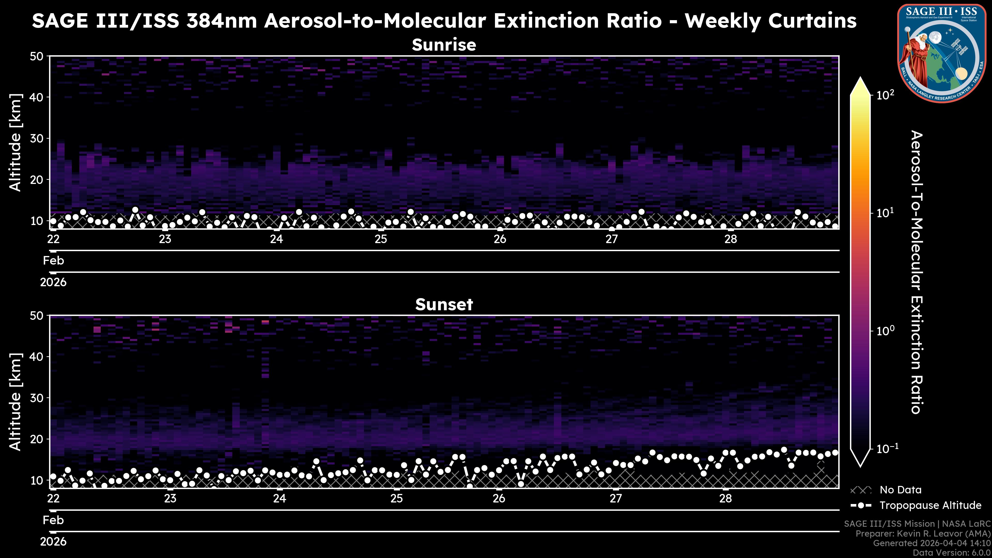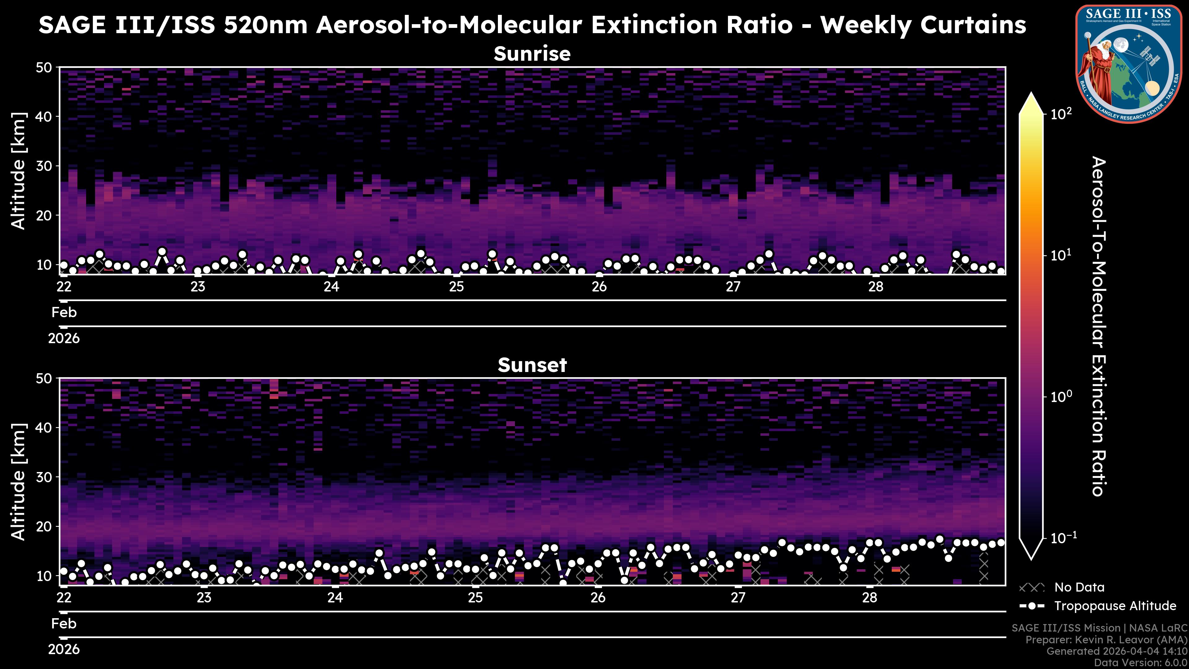 Welcome to the SAGE III/ISS portal for a “quick-look” at mission Level 2 solar data products. Primarily, the vertically resolved data are segregated by time progressing from the entire length of the mission to-date, to monthly zonal means, to weekly curtains and culminating in daily groupings of individual profiles. The monthly zonal means combine both sunrise and sunset events, while all other images are grouped by the rising or setting of the sun as seen from the ISS. For all but a few days a year the solar event is the same at the ground/atmosphere as it is from the ISS.