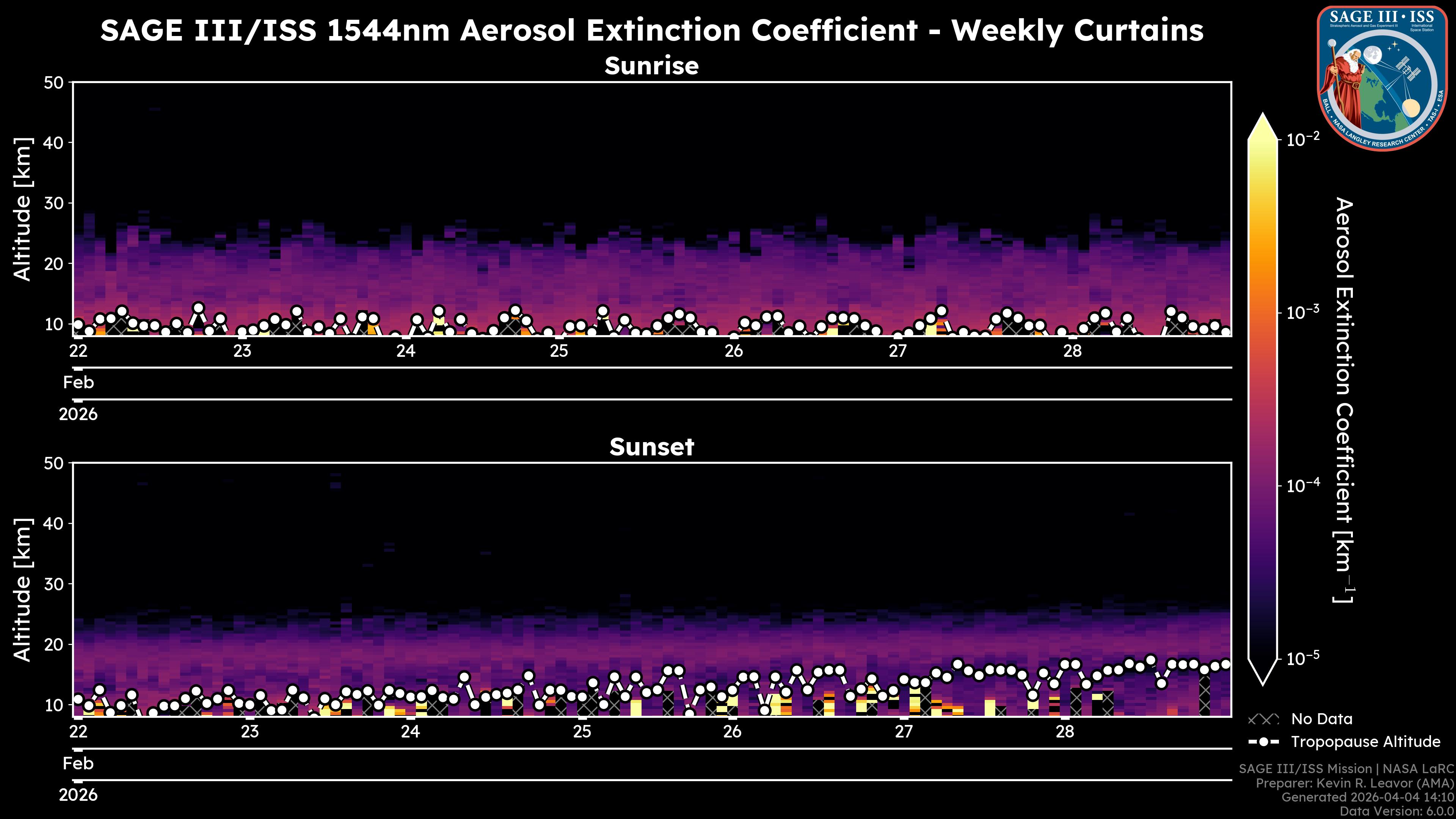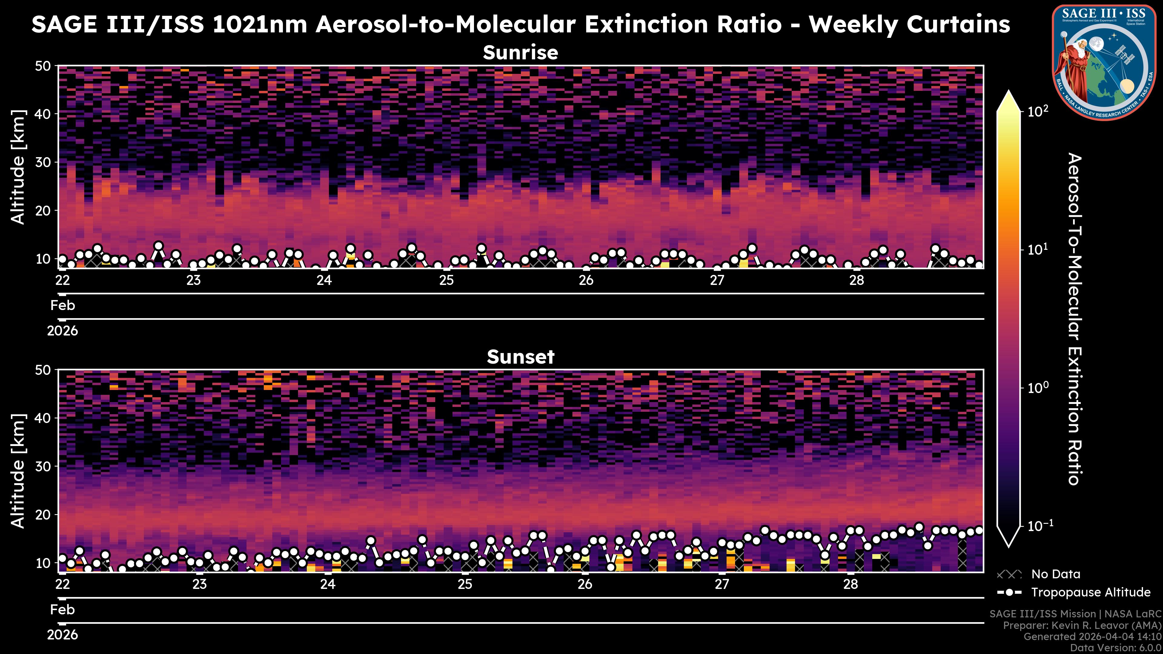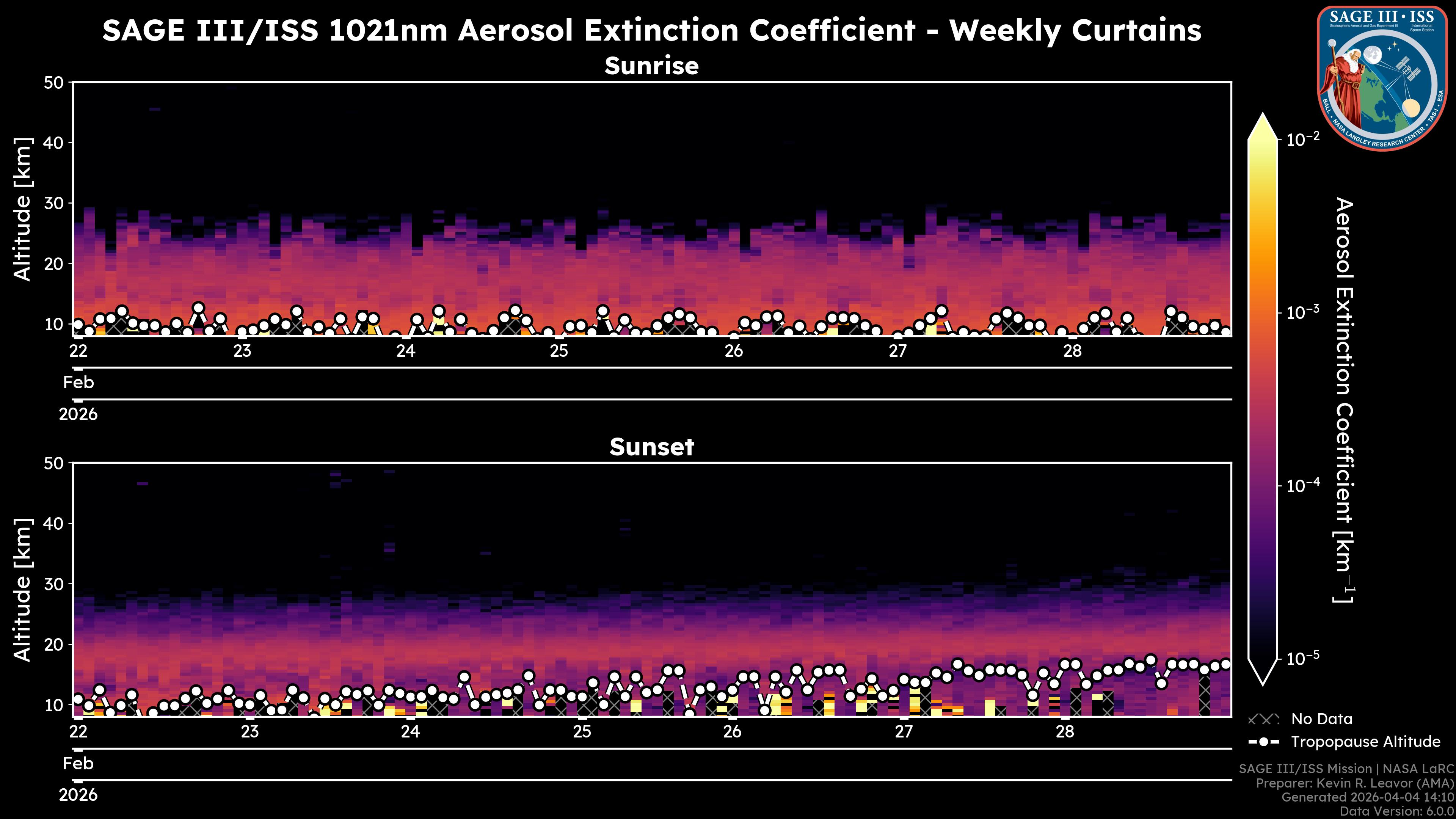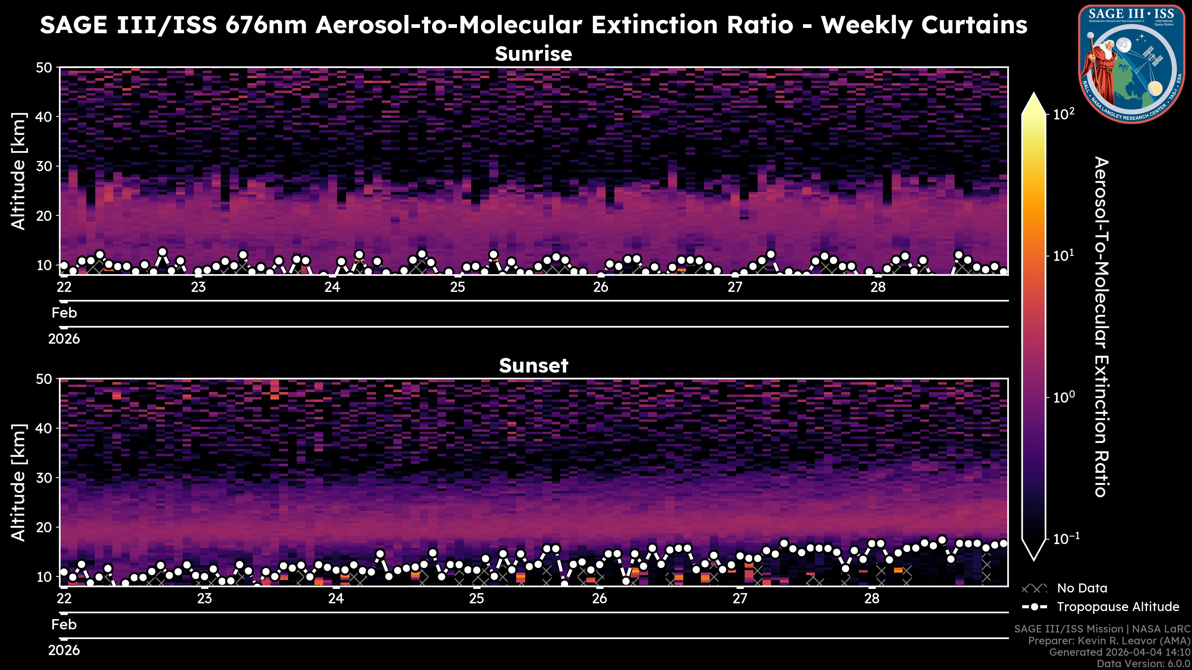 Welcome to the SAGE III/ISS portal for a “quick-look” at mission Level 2 solar data products. Primarily, the vertically resolved data are segregated by time progressing from the entire length of the mission to-date, to monthly zonal means, to weekly curtains and culminating in daily groupings of individual profiles. The monthly zonal means combine both sunrise and sunset events, while all other images are grouped by the rising or setting of the sun as seen from the ISS. For all but a few days a year the solar event is the same at the ground/atmosphere as it is from the ISS.