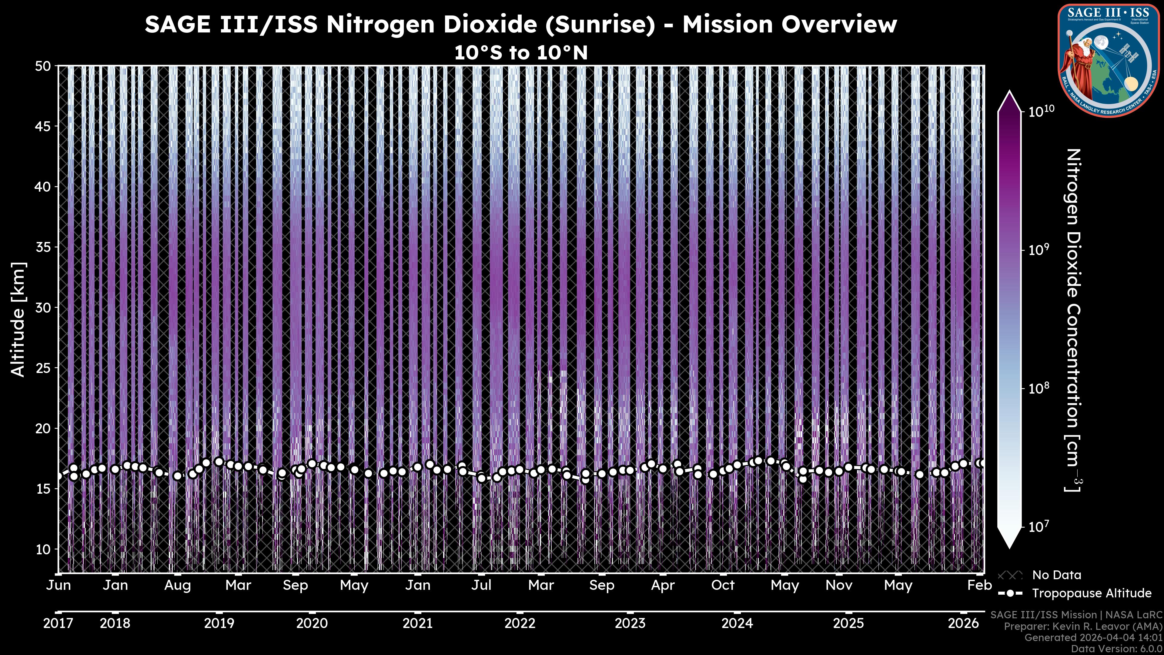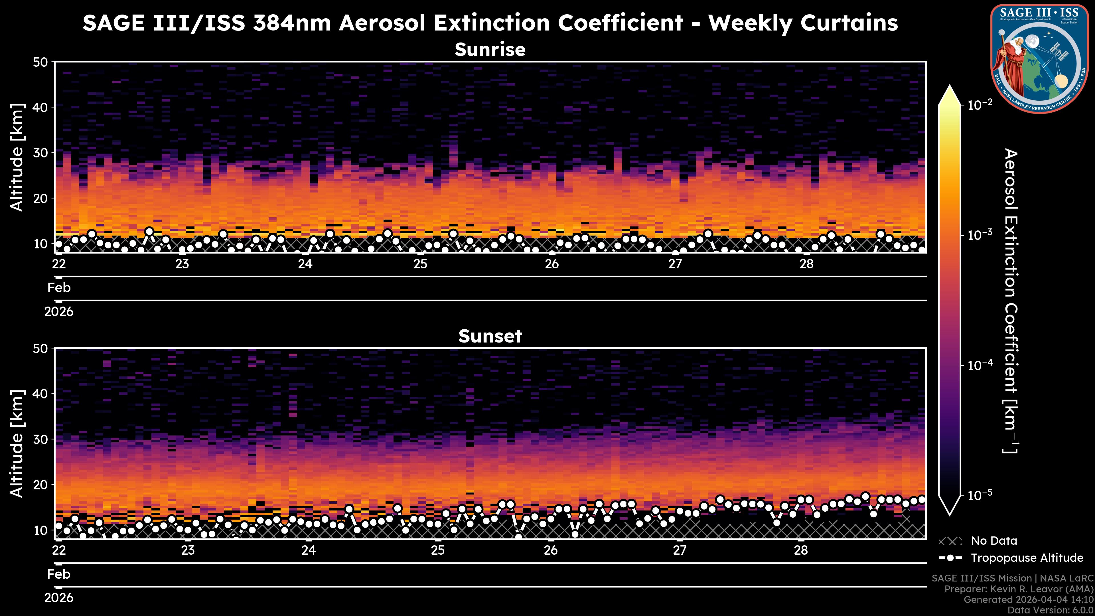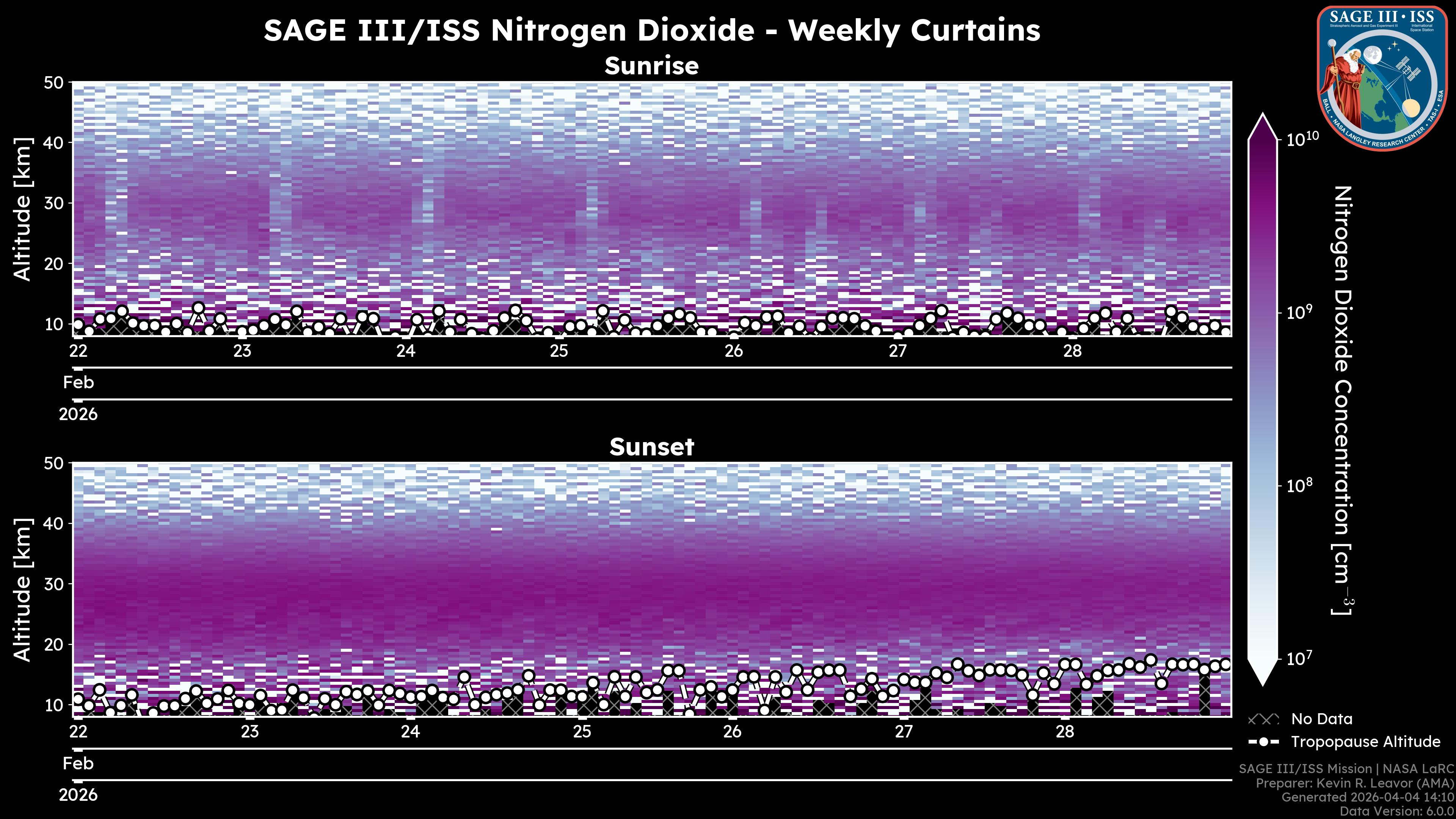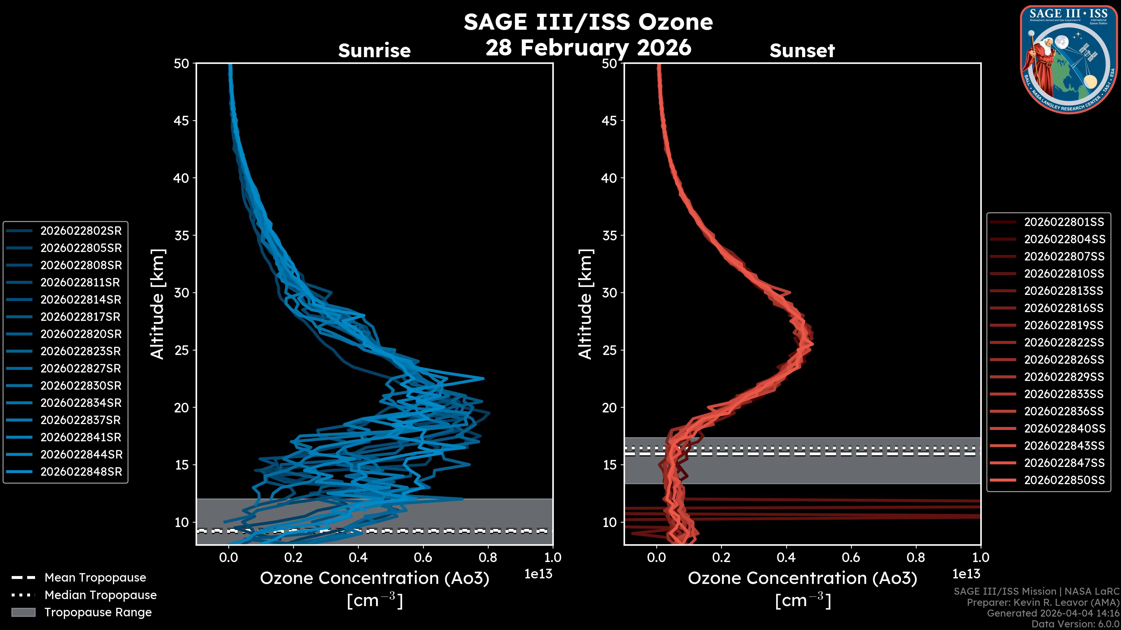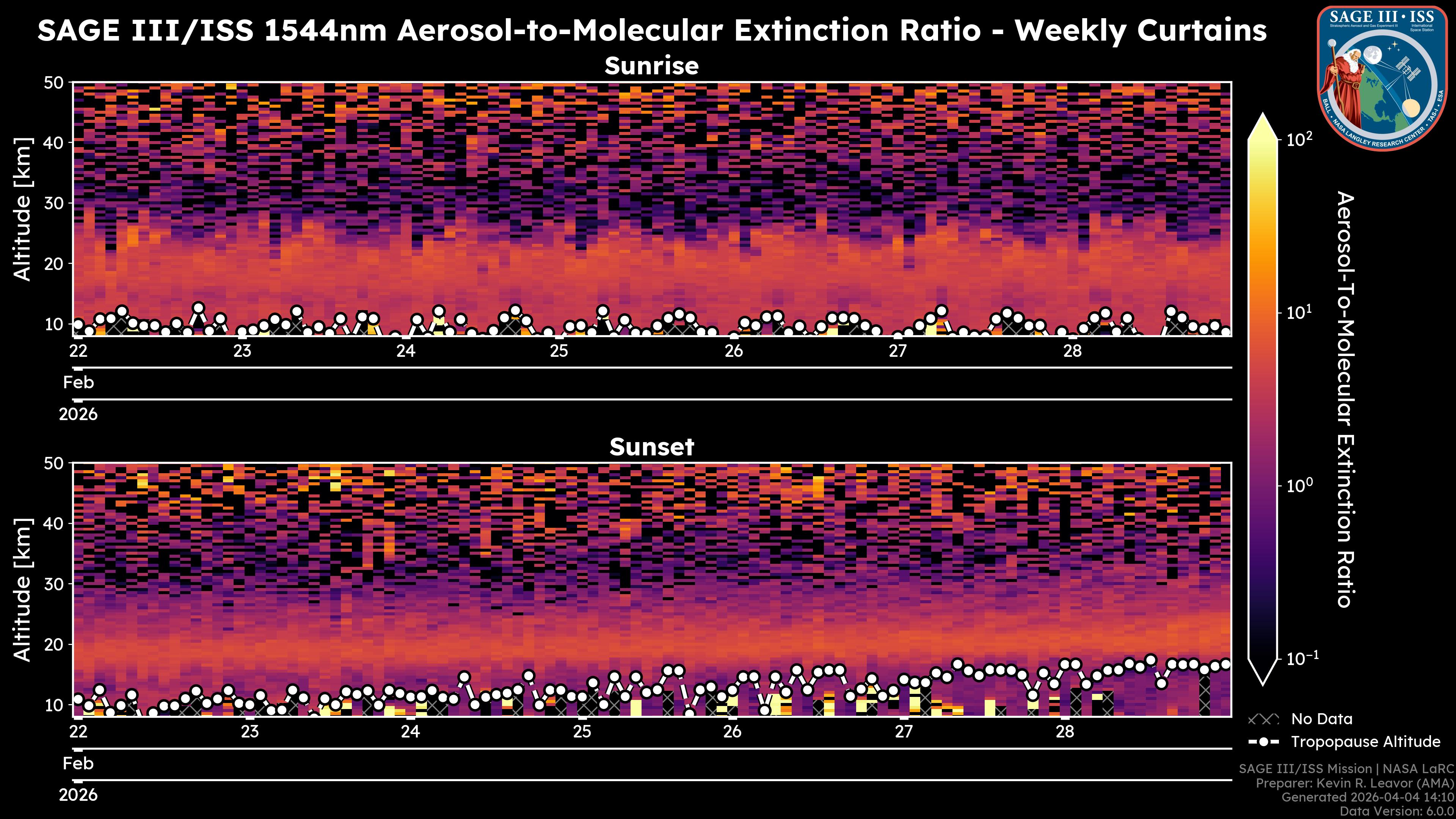 Welcome to the SAGE III/ISS portal for a “quick-look” at mission Level 2 solar data products. Primarily, the vertically resolved data are segregated by time progressing from the entire length of the mission to-date, to monthly zonal means, to weekly curtains and culminating in daily groupings of individual profiles. The monthly zonal means combine both sunrise and sunset events, while all other images are grouped by the rising or setting of the sun as seen from the ISS. For all but a few days a year the solar event is the same at the ground/atmosphere as it is from the ISS.