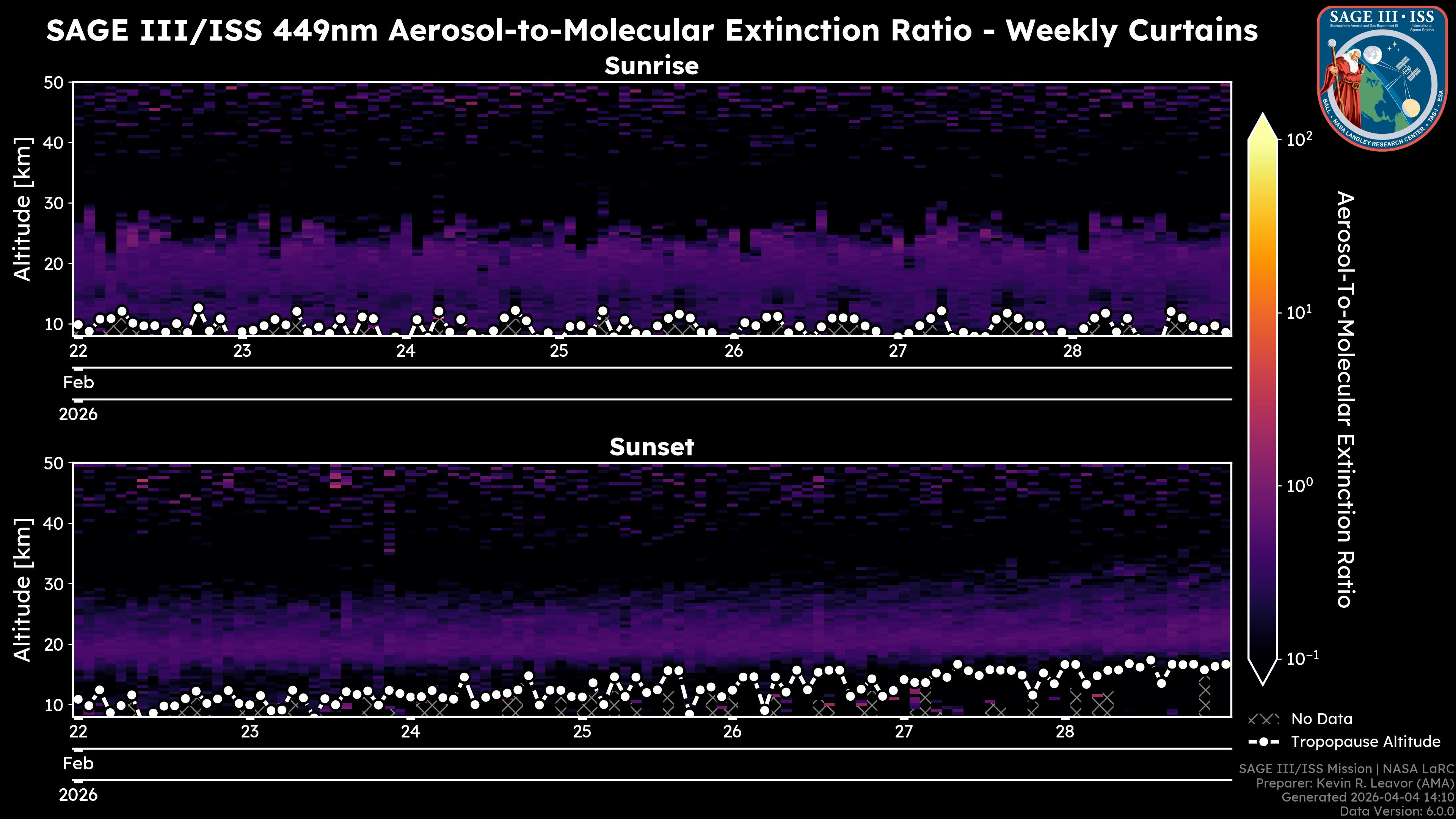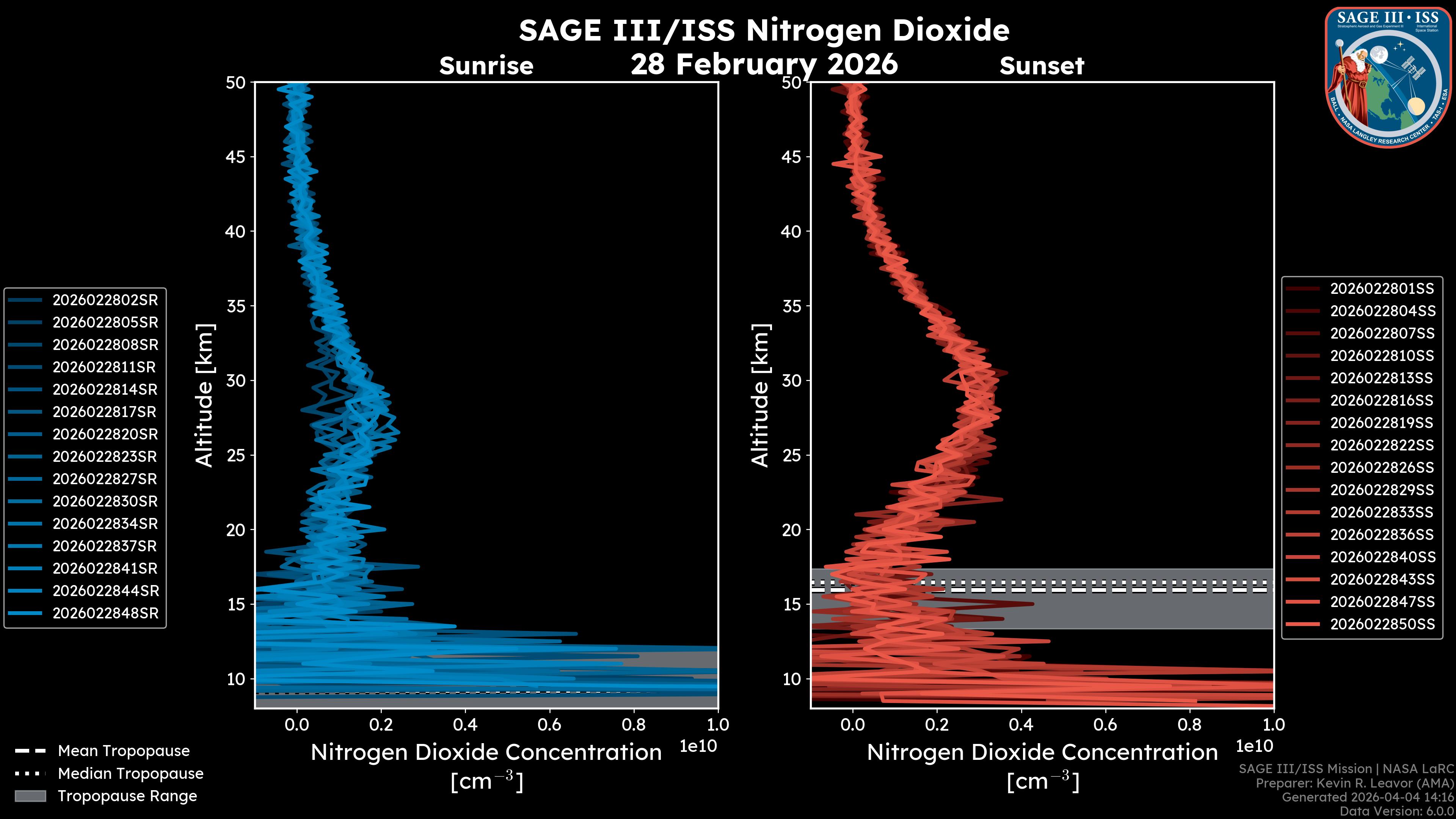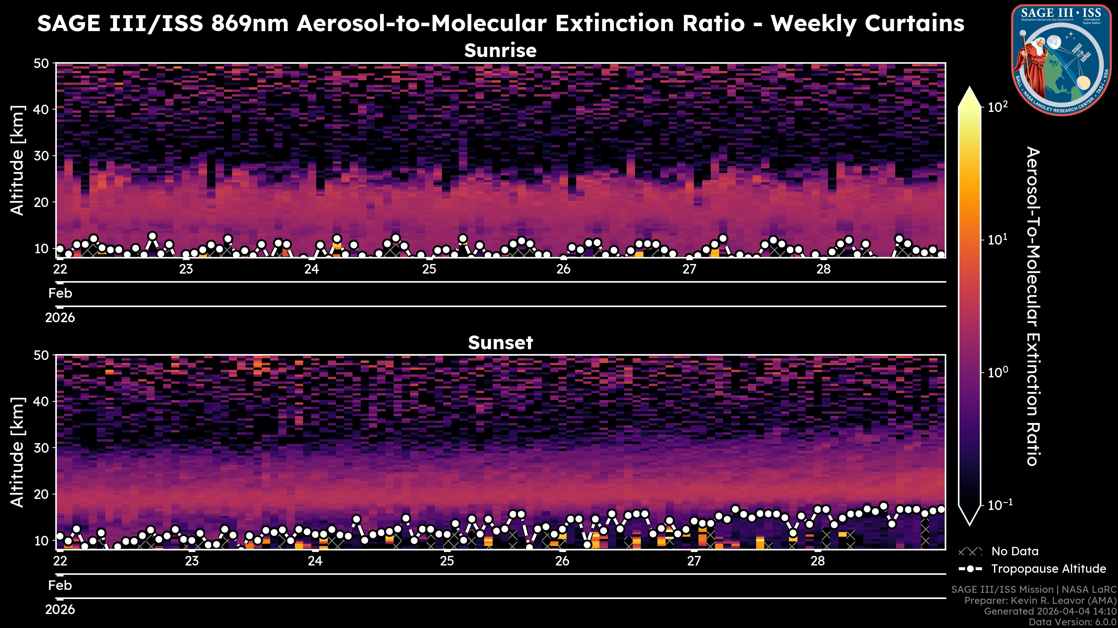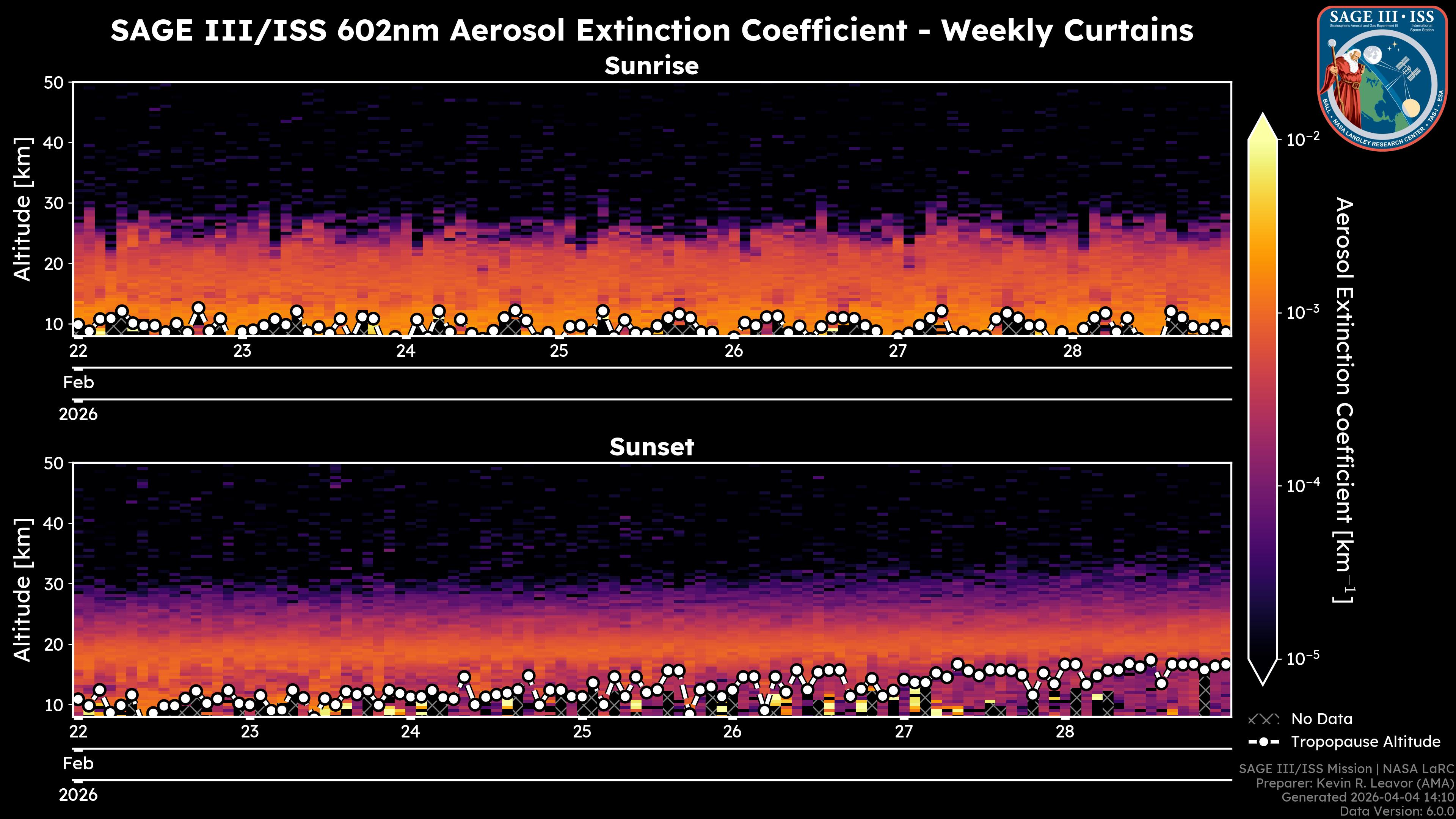 Welcome to the SAGE III/ISS portal for a “quick-look” at mission Level 2 solar data products. Primarily, the vertically resolved data are segregated by time progressing from the entire length of the mission to-date, to monthly zonal means, to weekly curtains and culminating in daily groupings of individual profiles. The monthly zonal means combine both sunrise and sunset events, while all other images are grouped by the rising or setting of the sun as seen from the ISS. For all but a few days a year the solar event is the same at the ground/atmosphere as it is from the ISS.