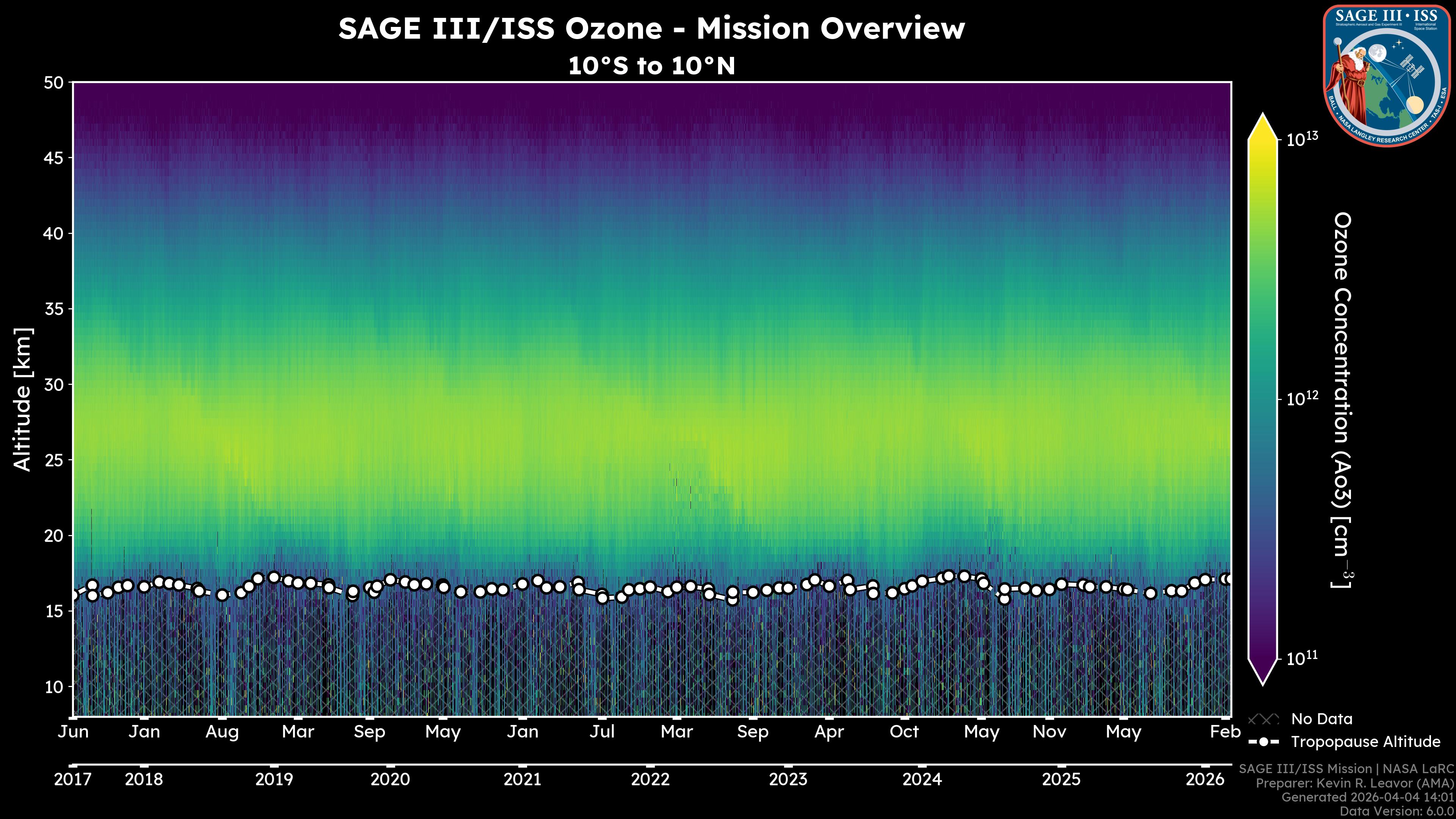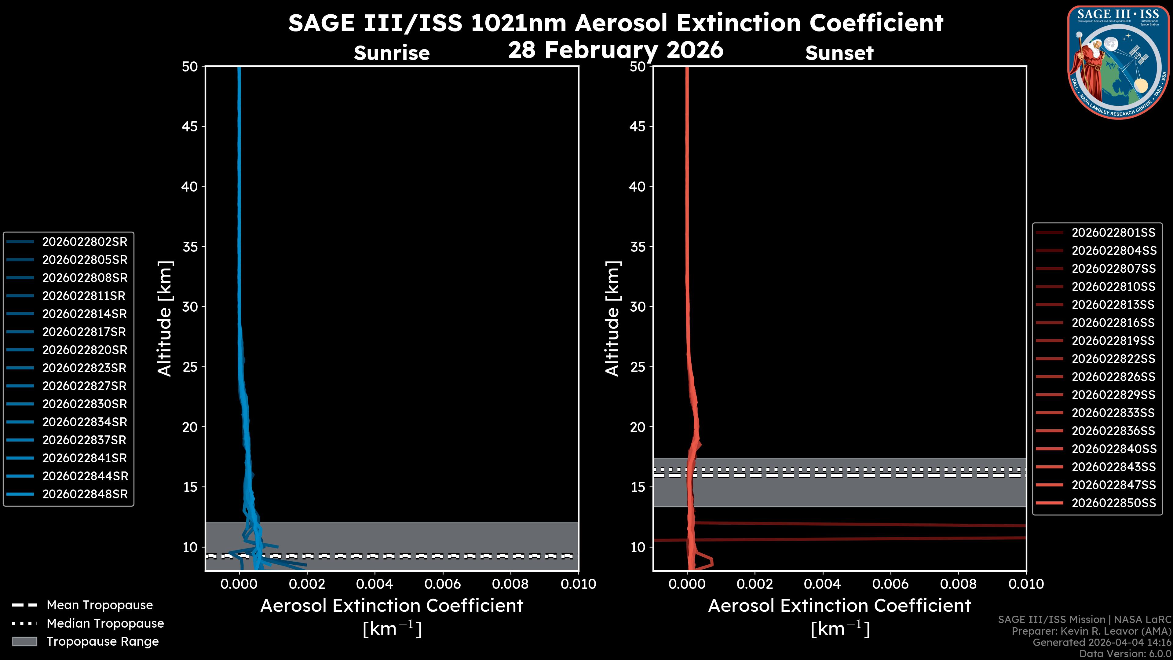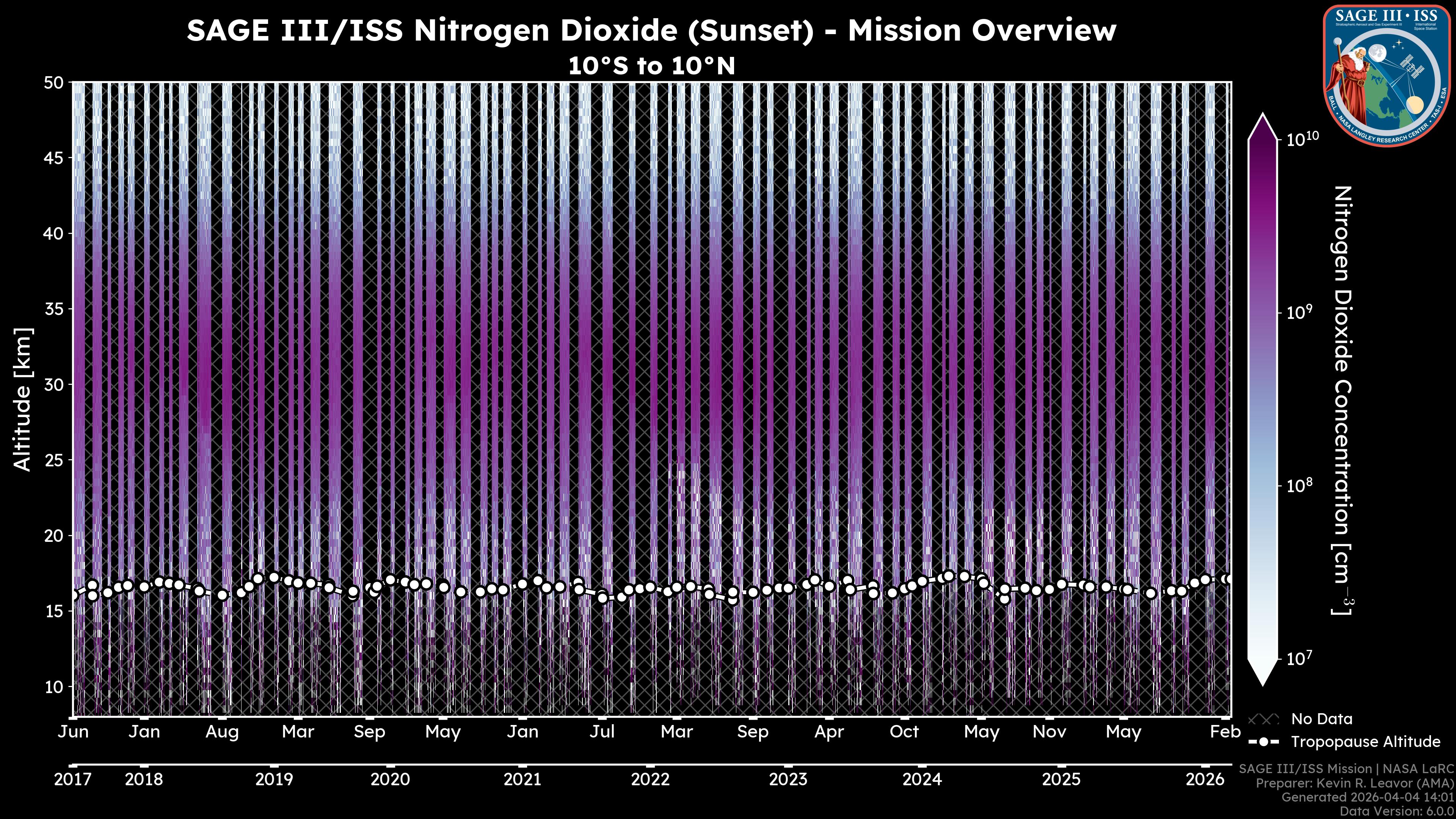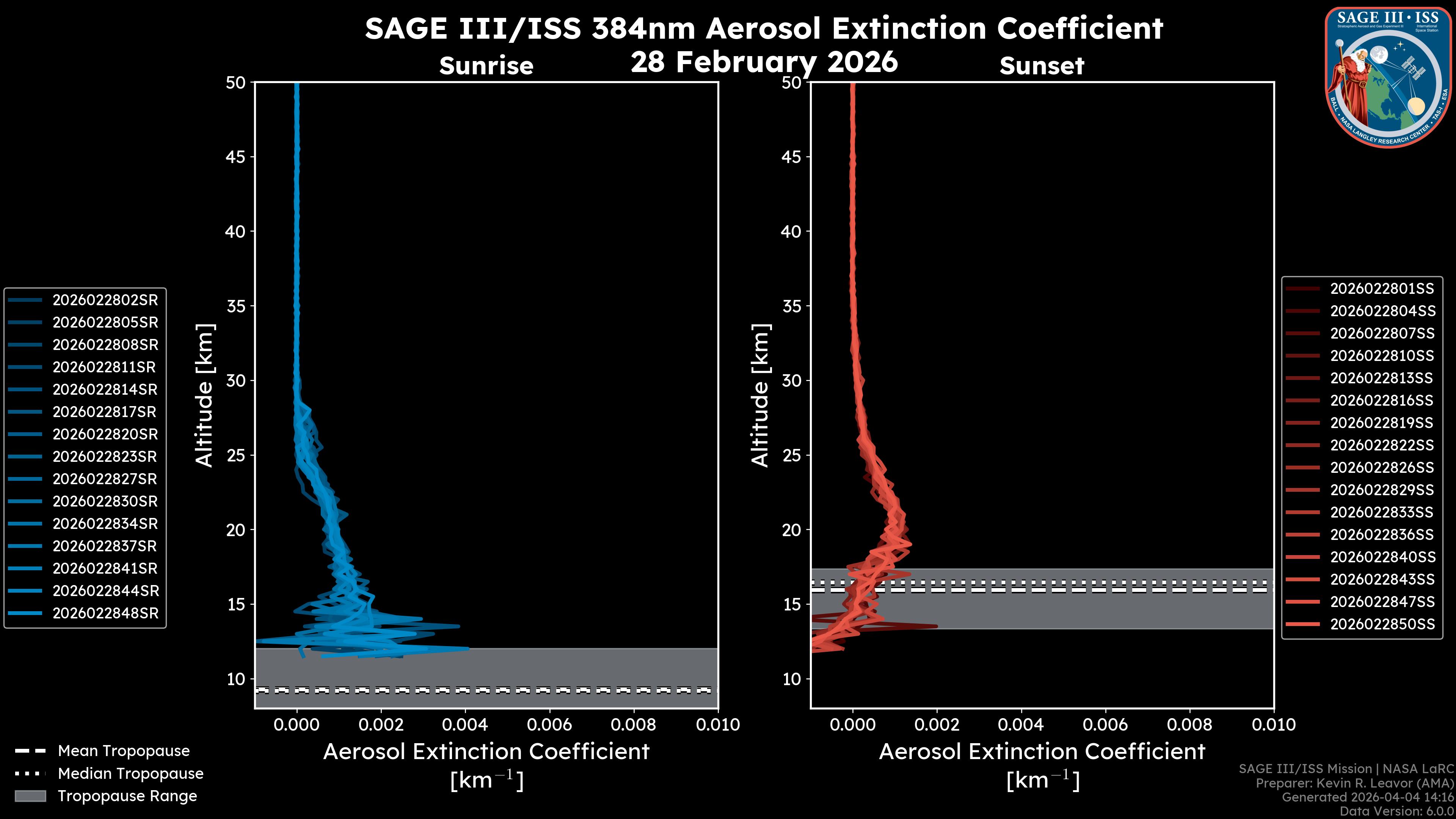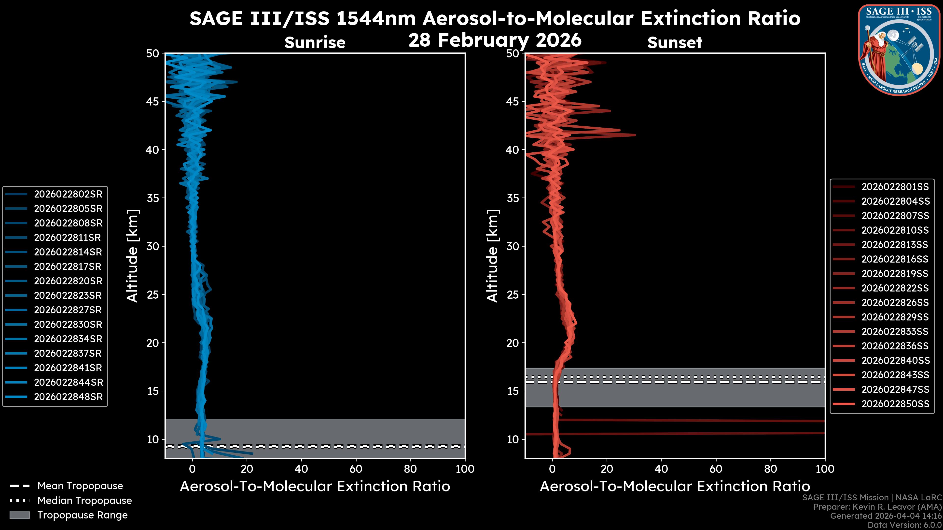 Welcome to the SAGE III/ISS portal for a “quick-look” at mission Level 2 solar data products. Primarily, the vertically resolved data are segregated by time progressing from the entire length of the mission to-date, to monthly zonal means, to weekly curtains and culminating in daily groupings of individual profiles. The monthly zonal means combine both sunrise and sunset events, while all other images are grouped by the rising or setting of the sun as seen from the ISS. For all but a few days a year the solar event is the same at the ground/atmosphere as it is from the ISS.