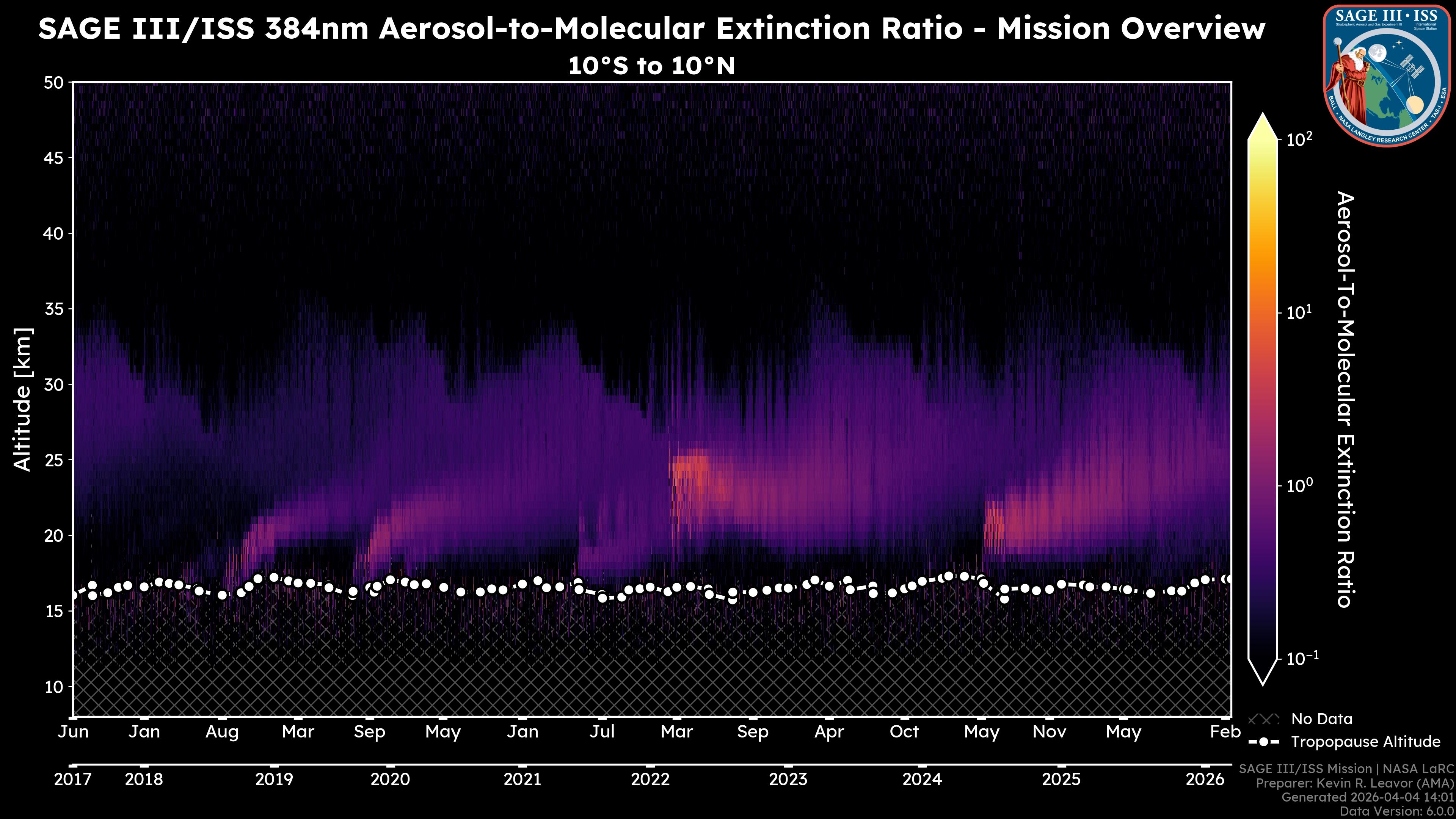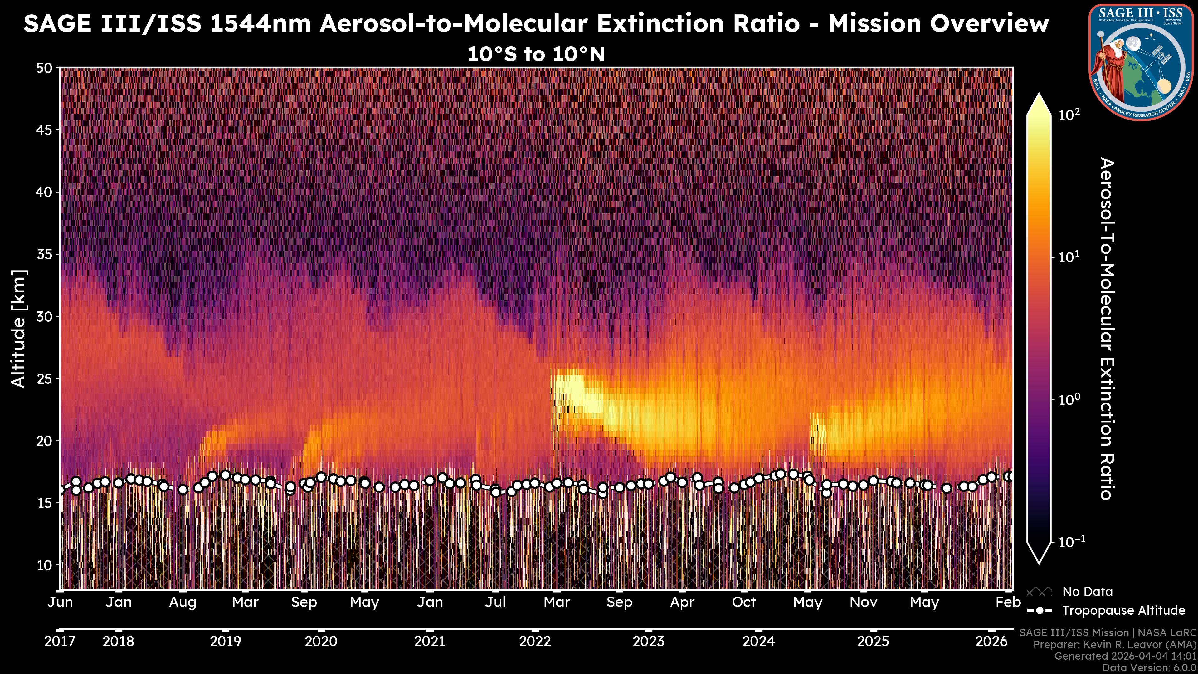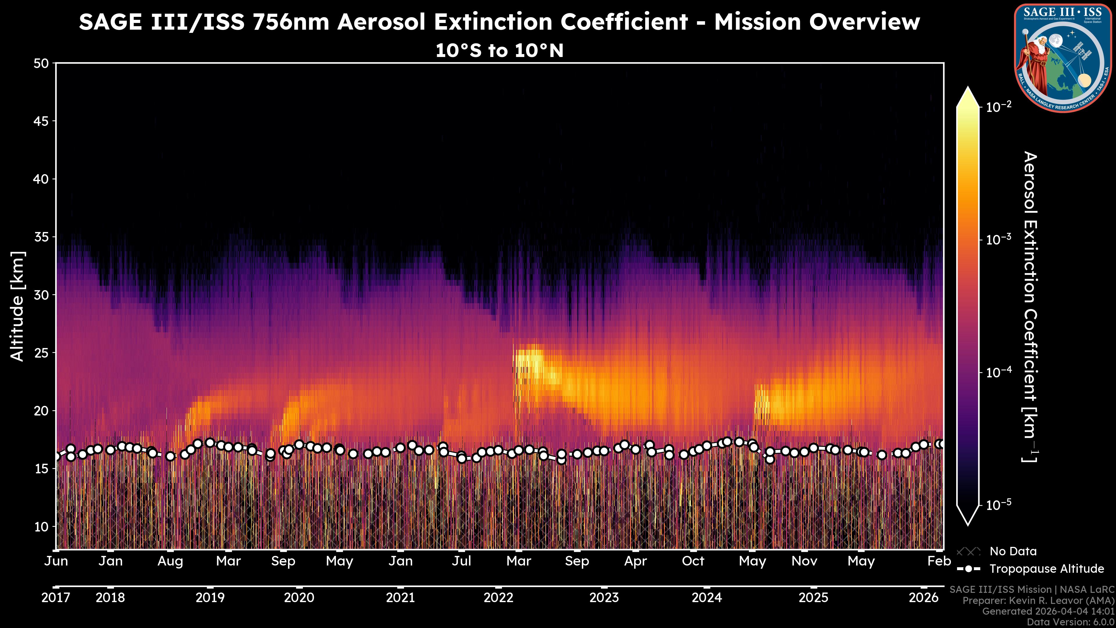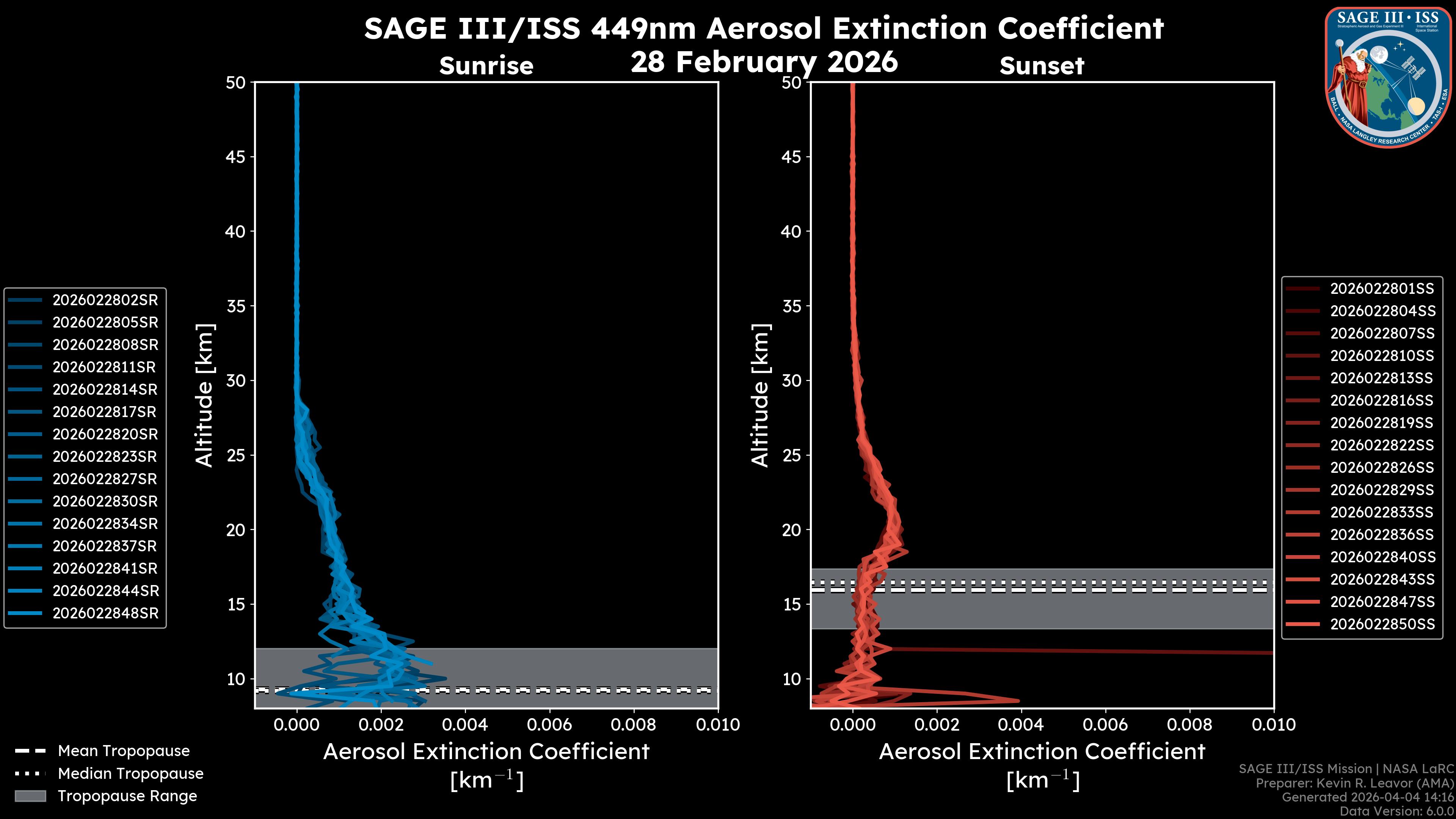 Welcome to the SAGE III/ISS portal for a “quick-look” at mission Level 2 solar data products. Primarily, the vertically resolved data are segregated by time progressing from the entire length of the mission to-date, to monthly zonal means, to weekly curtains and culminating in daily groupings of individual profiles. The monthly zonal means combine both sunrise and sunset events, while all other images are grouped by the rising or setting of the sun as seen from the ISS. For all but a few days a year the solar event is the same at the ground/atmosphere as it is from the ISS.