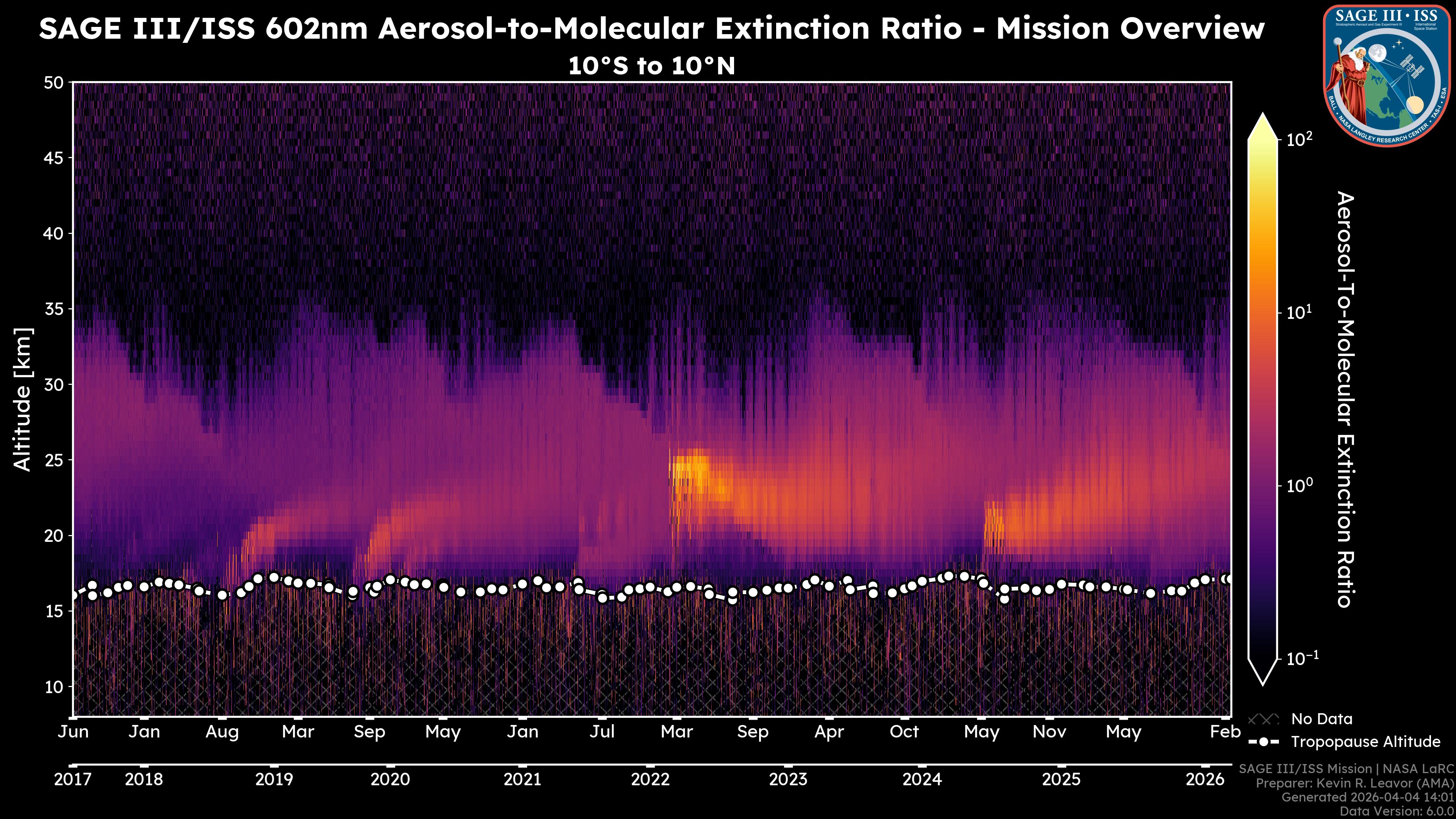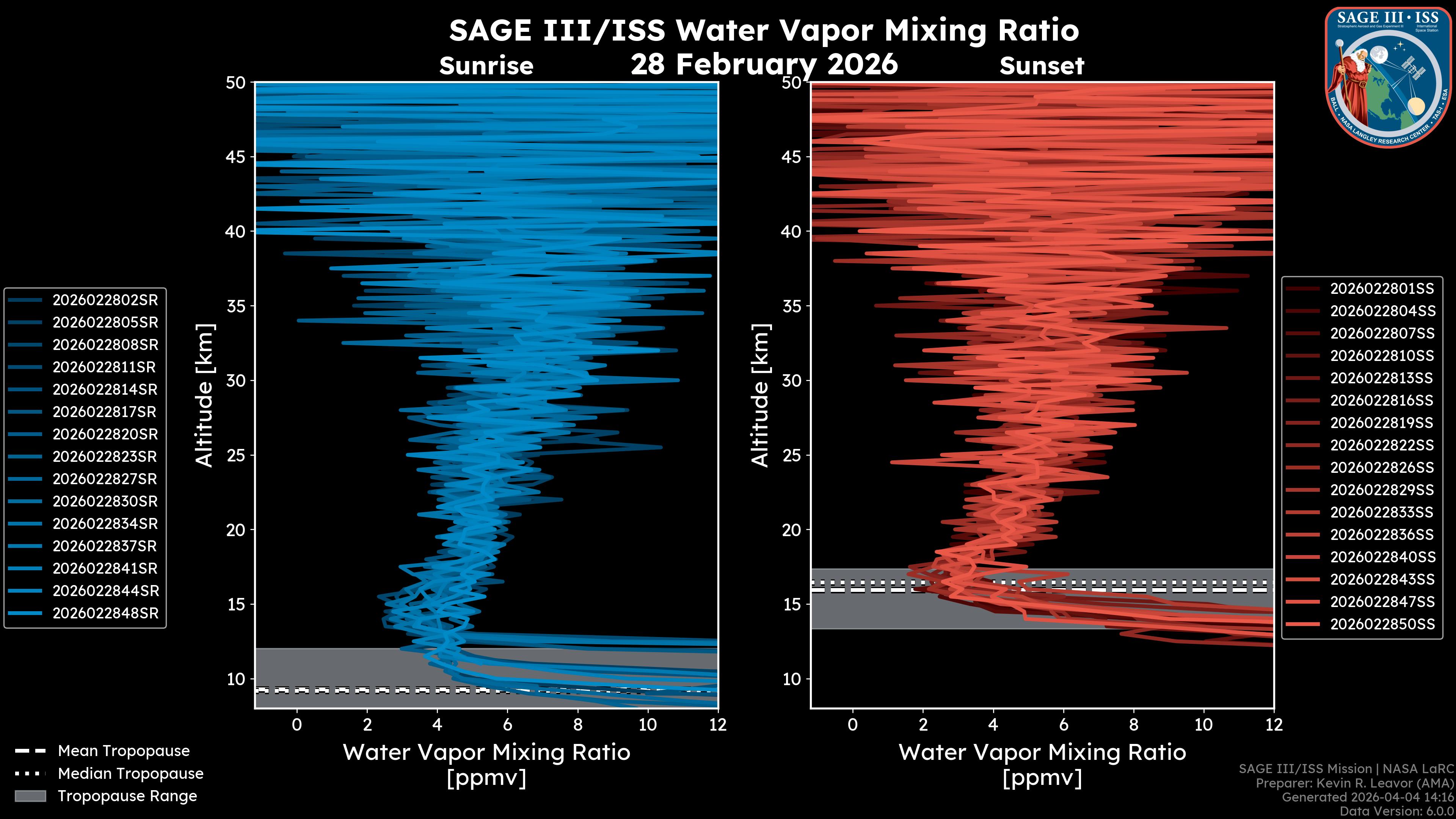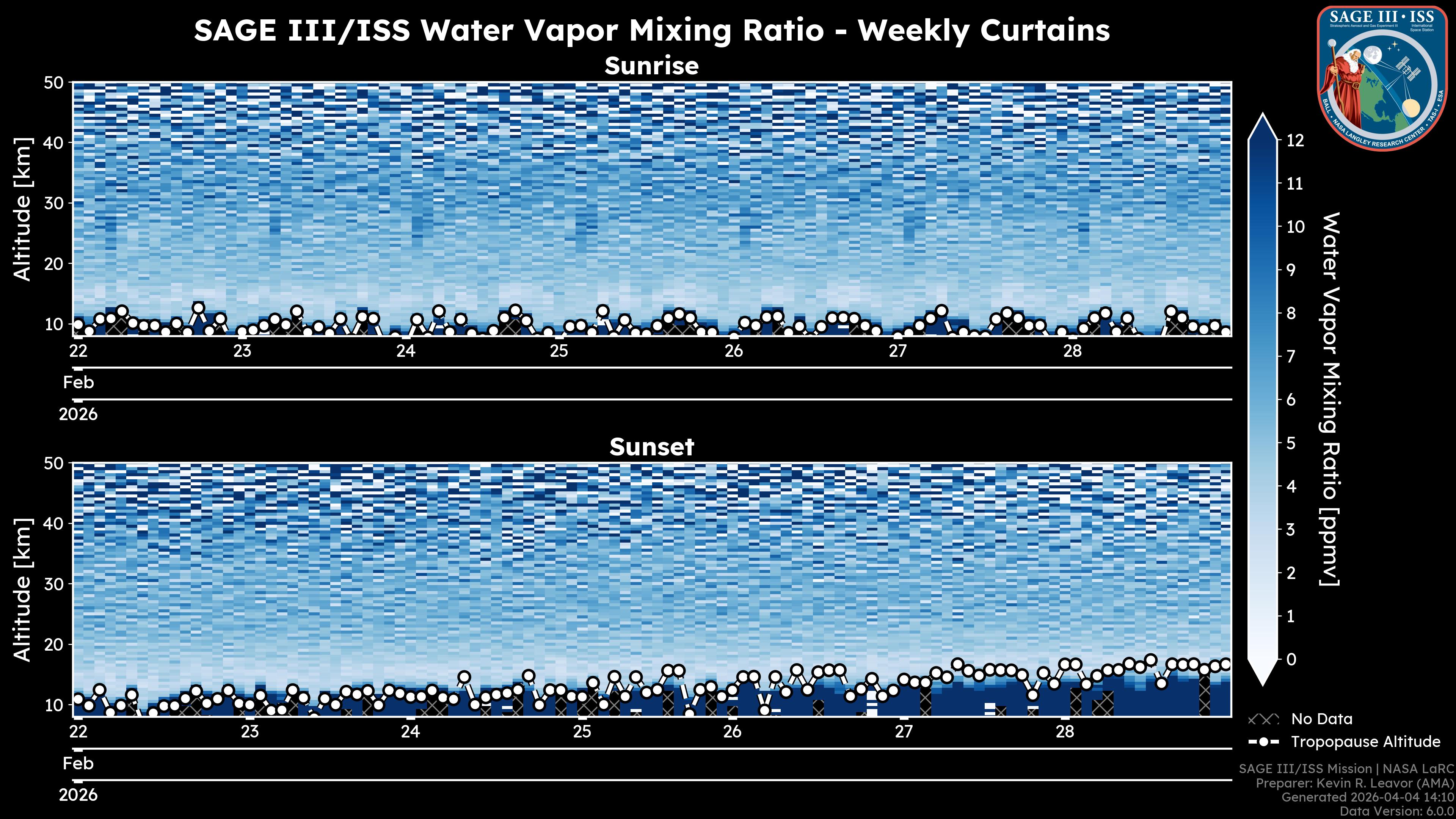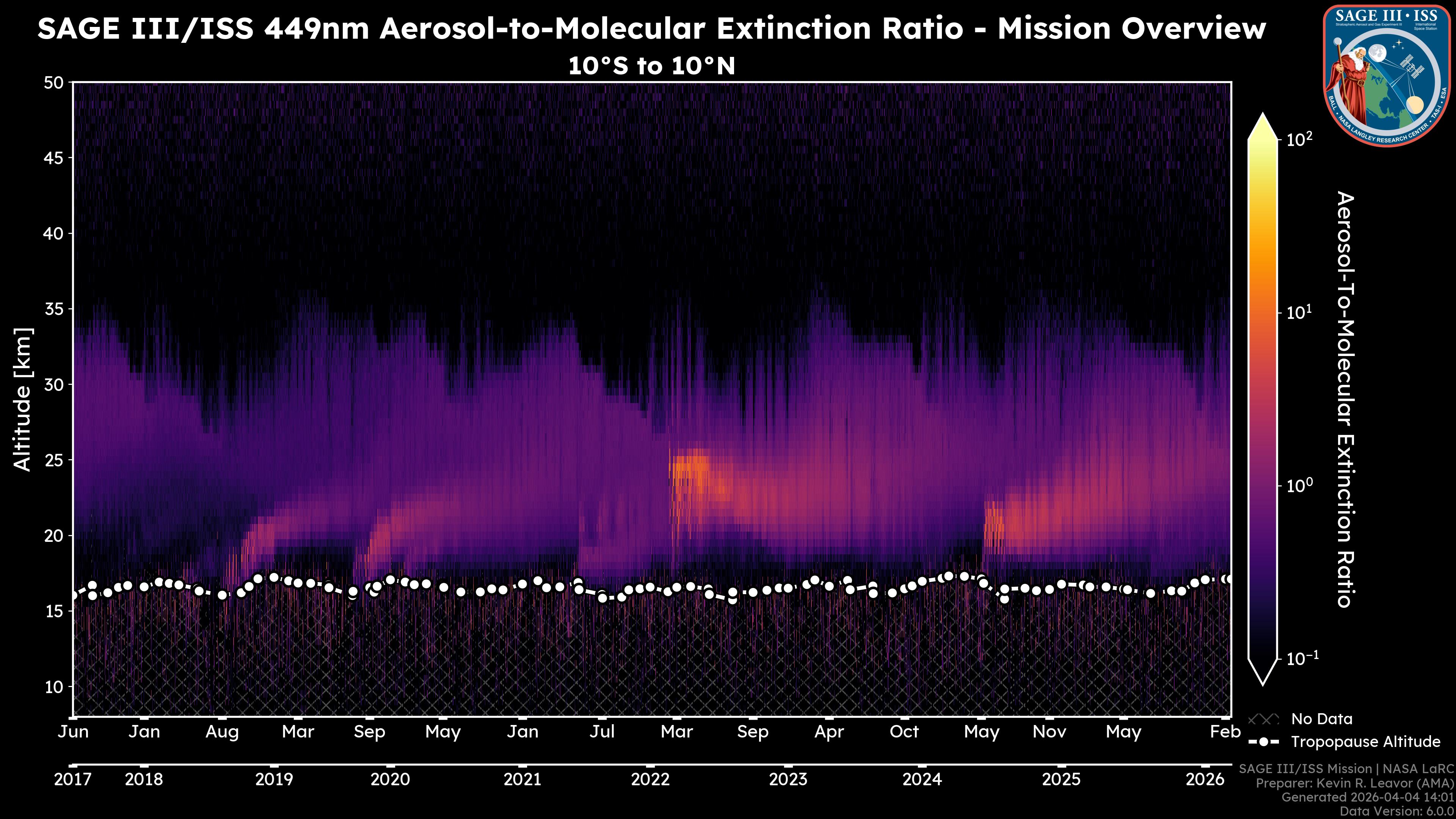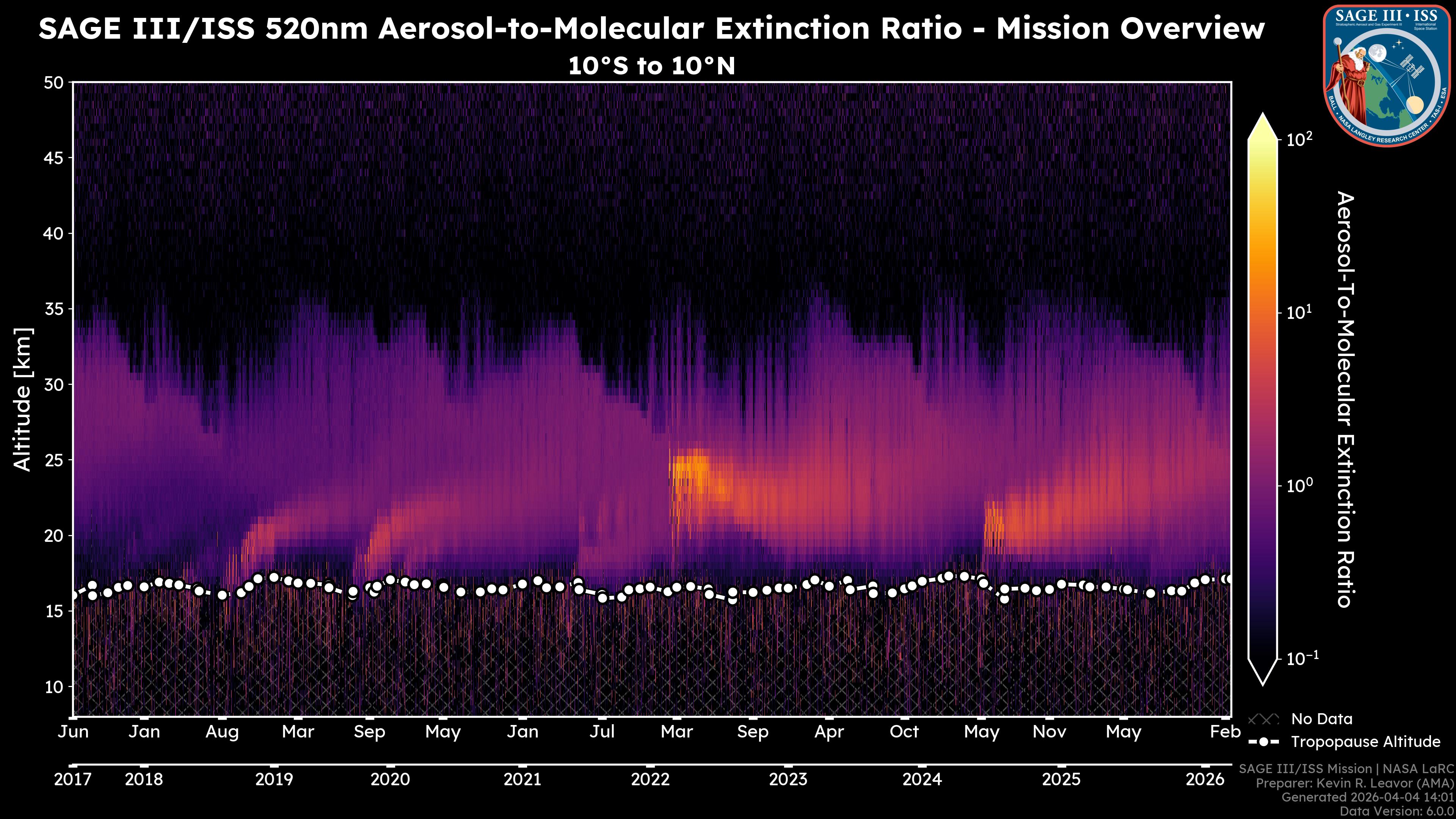 Welcome to the SAGE III/ISS portal for a “quick-look” at mission Level 2 solar data products. Primarily, the vertically resolved data are segregated by time progressing from the entire length of the mission to-date, to monthly zonal means, to weekly curtains and culminating in daily groupings of individual profiles. The monthly zonal means combine both sunrise and sunset events, while all other images are grouped by the rising or setting of the sun as seen from the ISS. For all but a few days a year the solar event is the same at the ground/atmosphere as it is from the ISS.