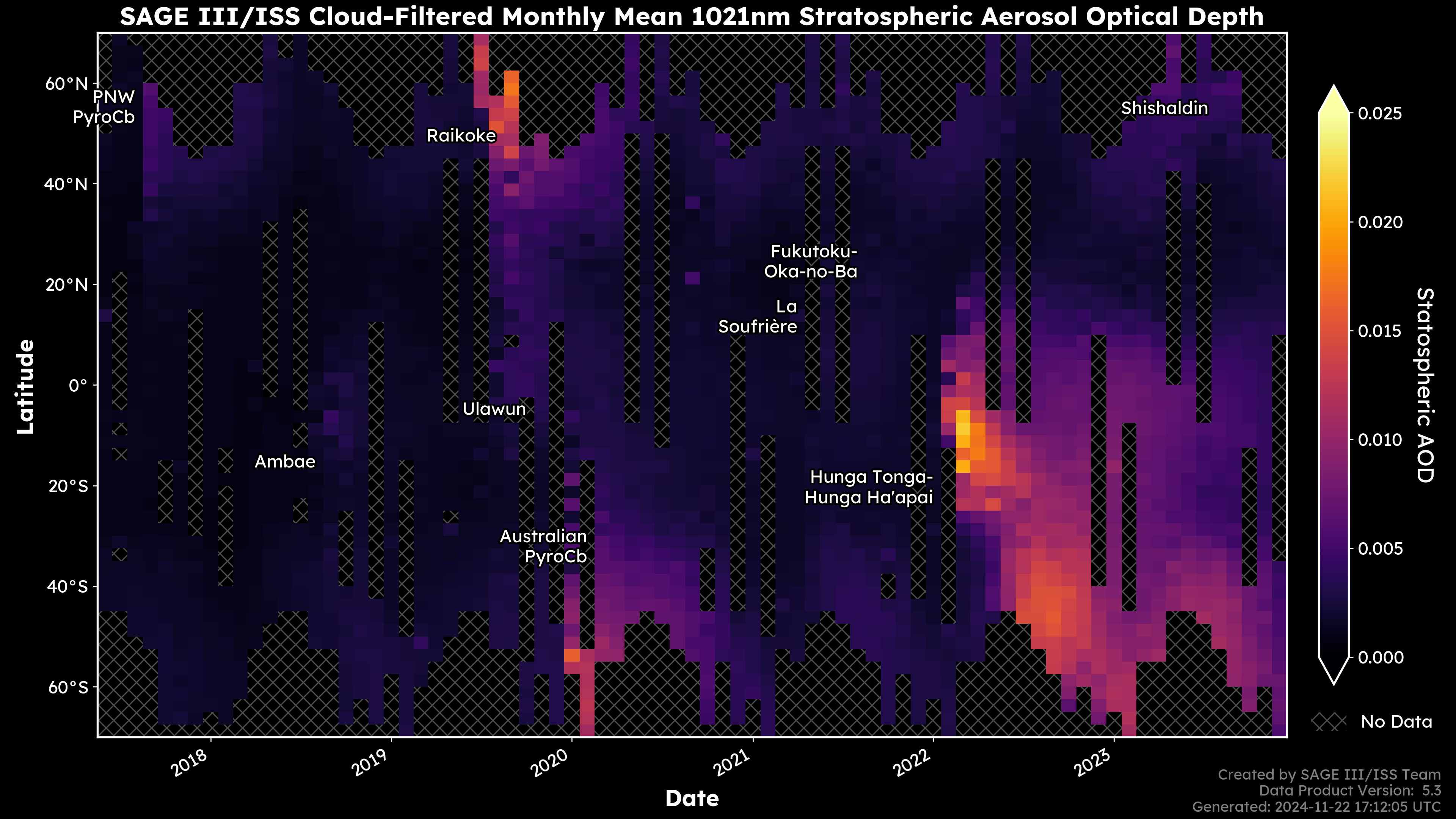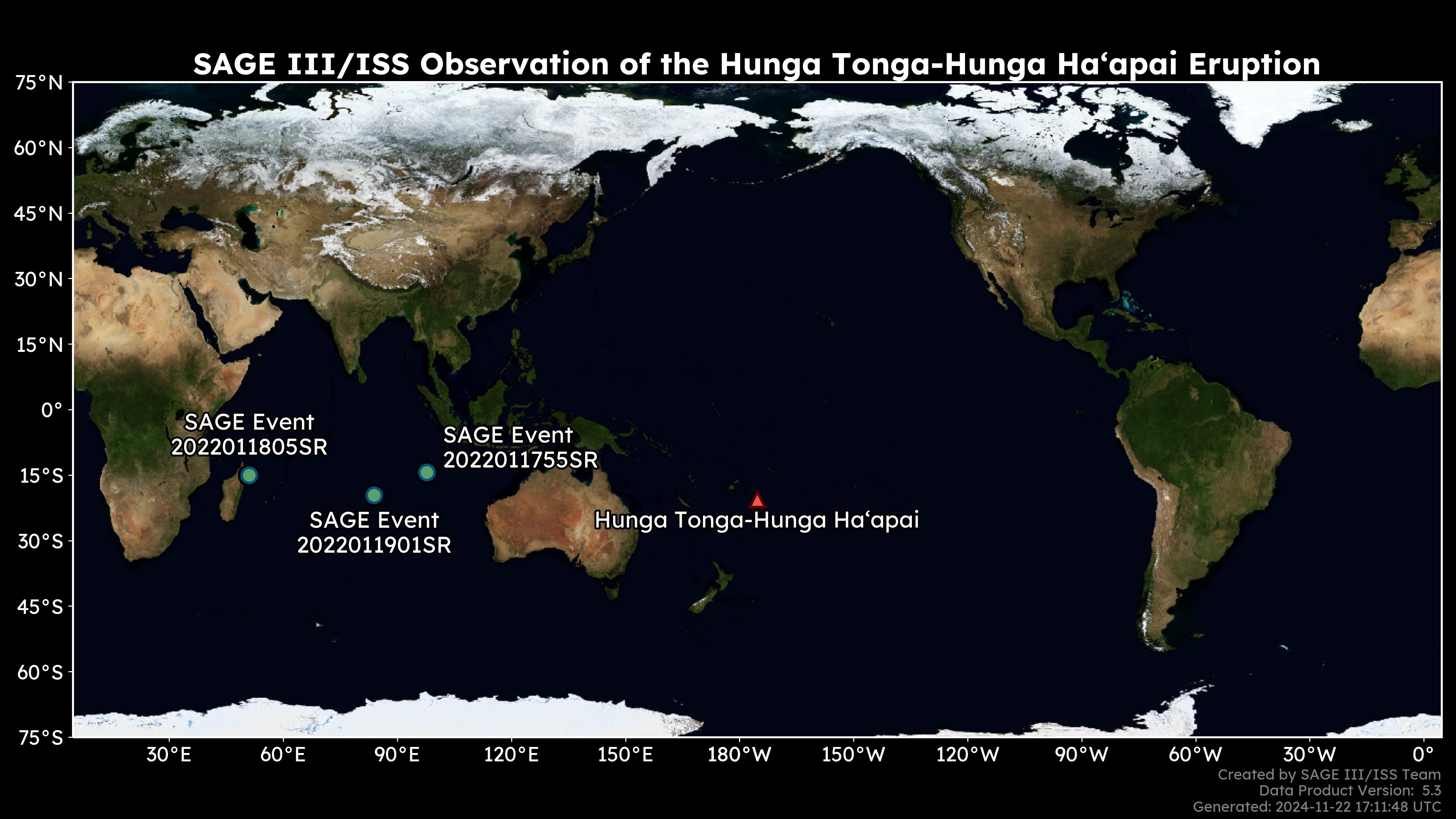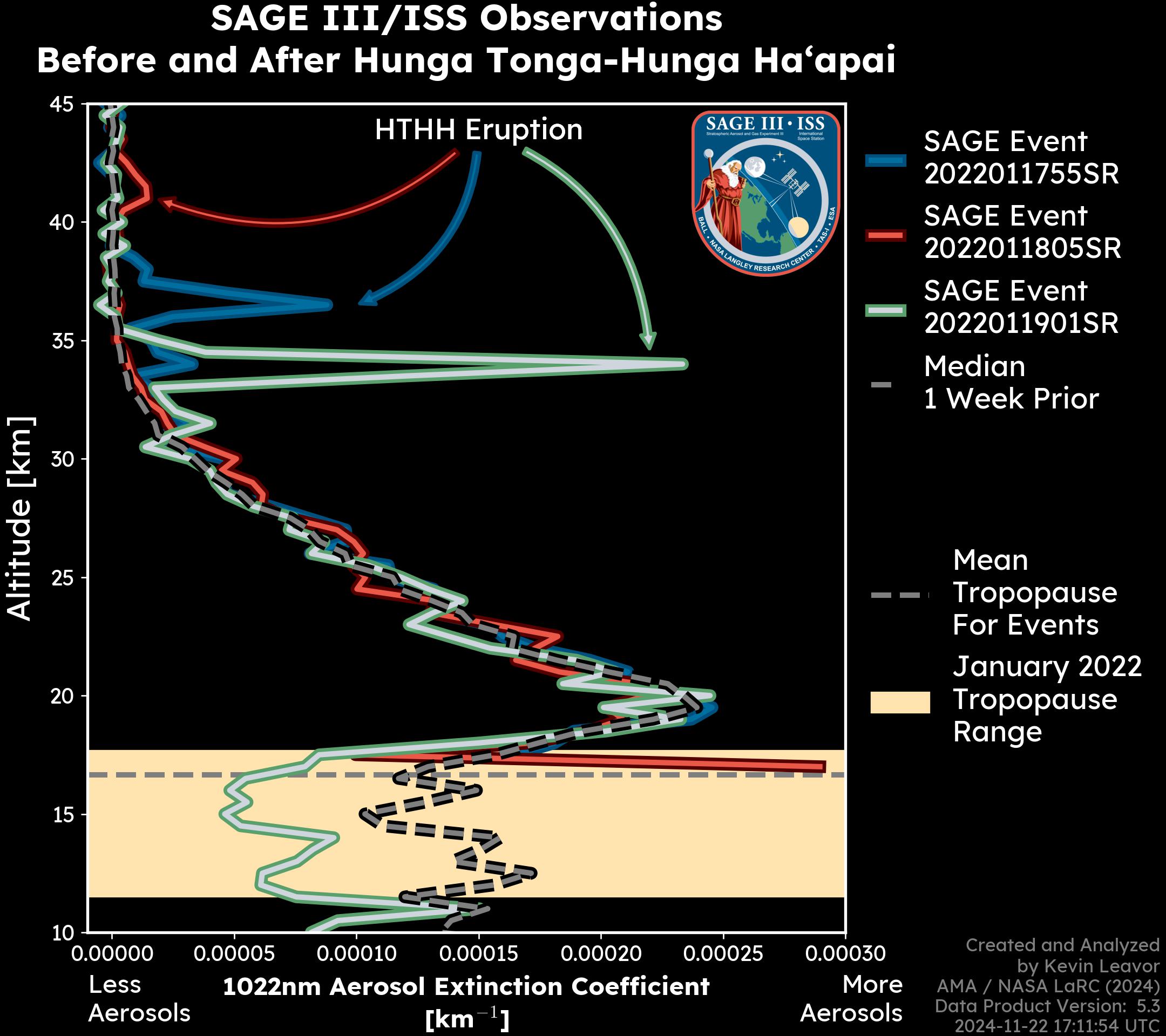 Satellite measurements of properties from impactful events such as the Hunga Tonga-Hunga Haʻapai eruption are useful for testing our understanding of atmospheric processes. SAGE III/ISS measurements of events such as this are used to inform modeling efforts and supporting climatologies such as the Global Space-based Stratospheric Aerosol Climatology (GloSSAC) (Kovilakam et al., 2022). As these events occur, the validation and outreach team try to release articles detailing what was seen and measured as close to the events as possible, such as SAGE III Sees Tonga Aerosols, Water Vapor Months After Eruption.