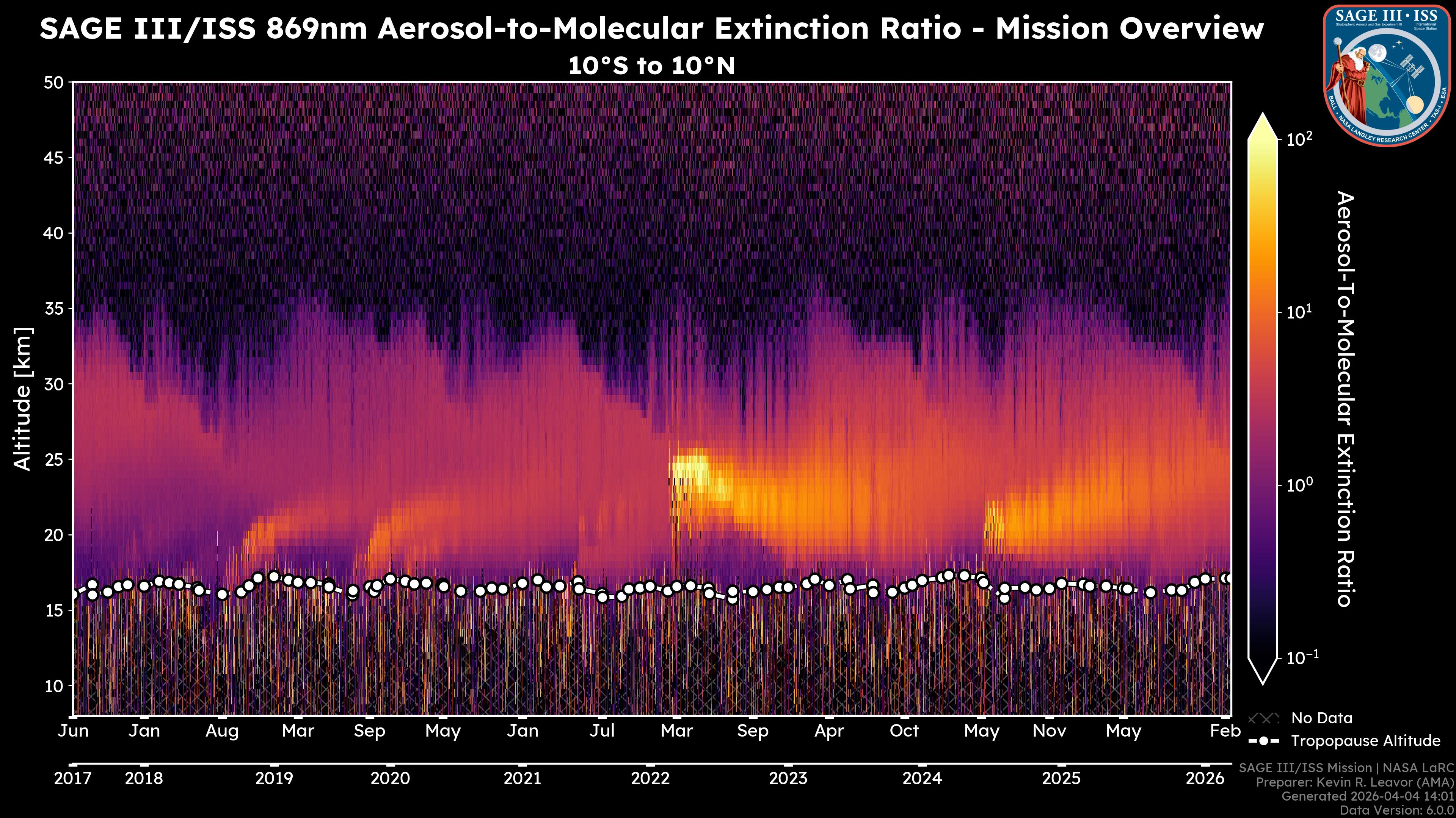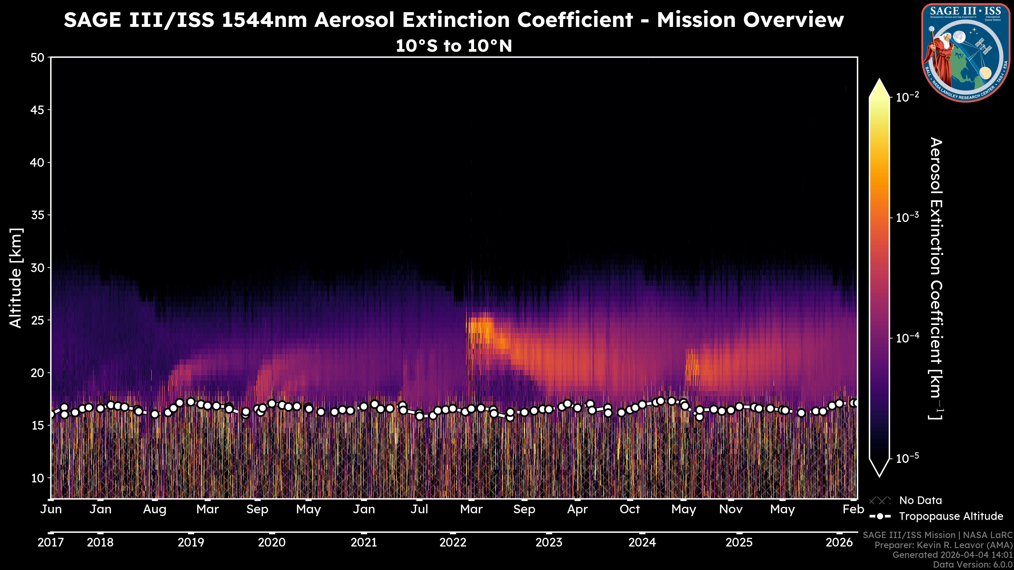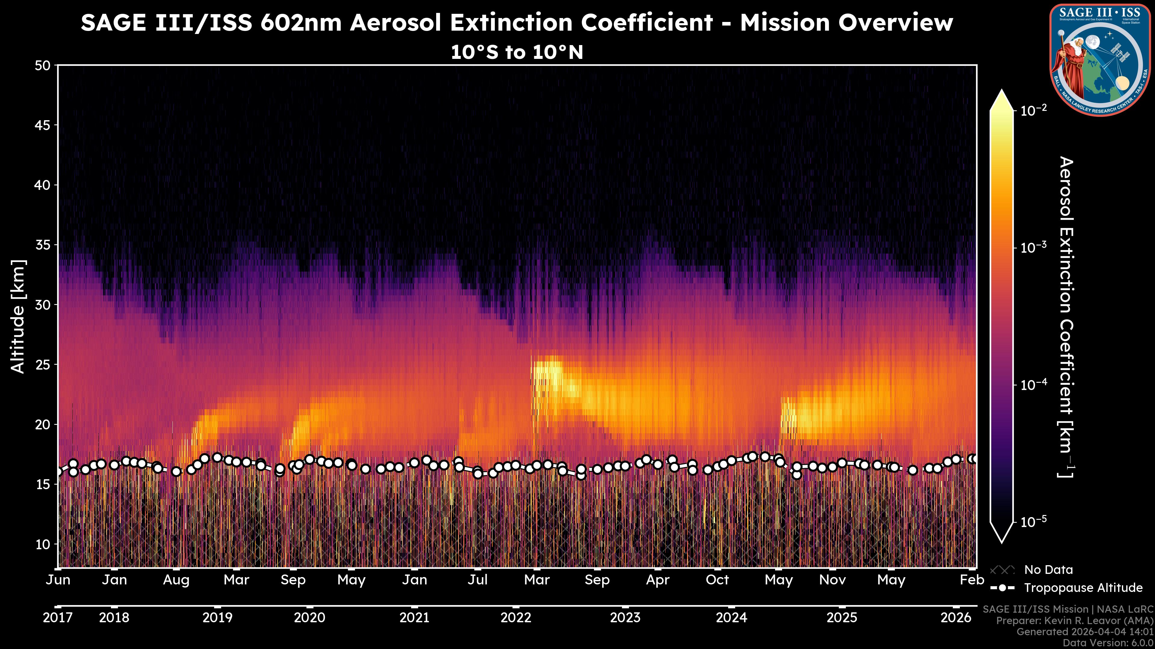 Satellite measurements of properties from impactful events such as the Hunga Tonga-Hunga Haʻapai eruption are useful for testing our understanding of atmospheric processes. SAGE III/ISS measurements of events such as this are used to inform modeling efforts and supporting climatologies such as the Global Space-based Stratospheric Aerosol Climatology (GloSSAC) (Kovilakam et al., 2022). As these events occur, the validation and outreach team try to release articles detailing what was seen and measured as close to the events as possible, such as SAGE III Sees Tonga Aerosols, Water Vapor Months After Eruption.