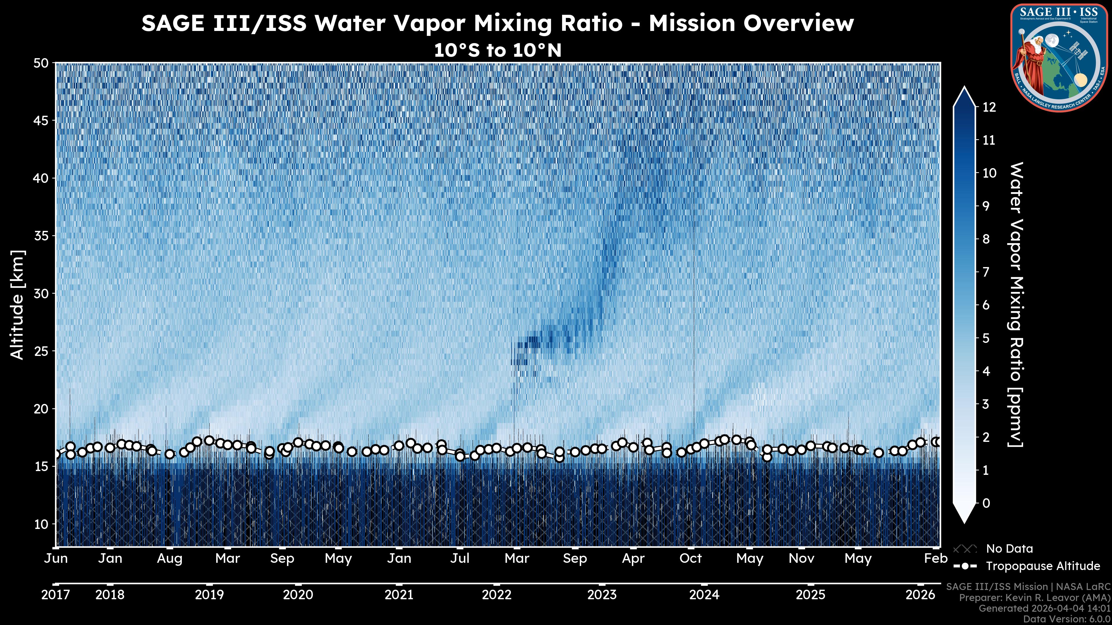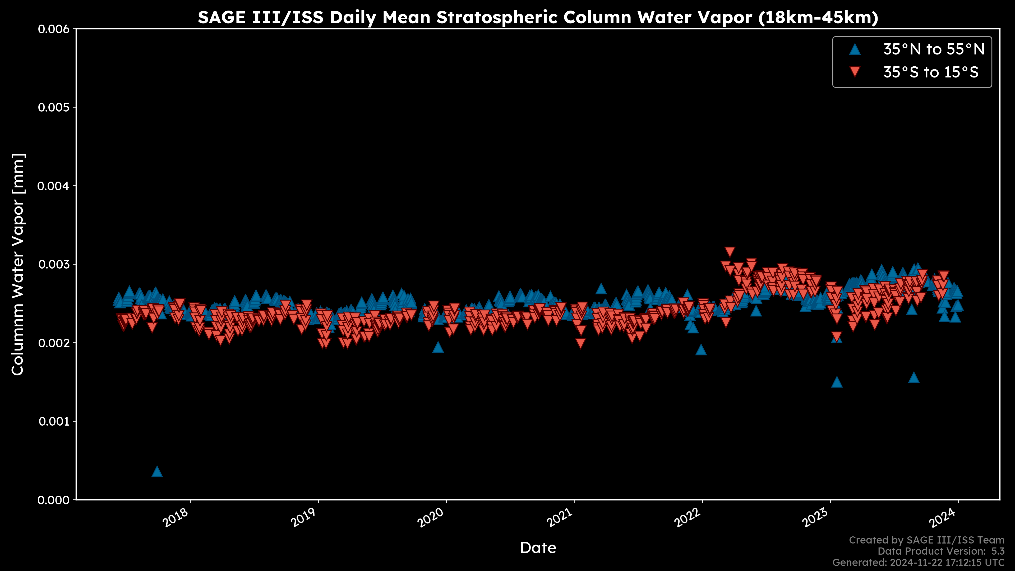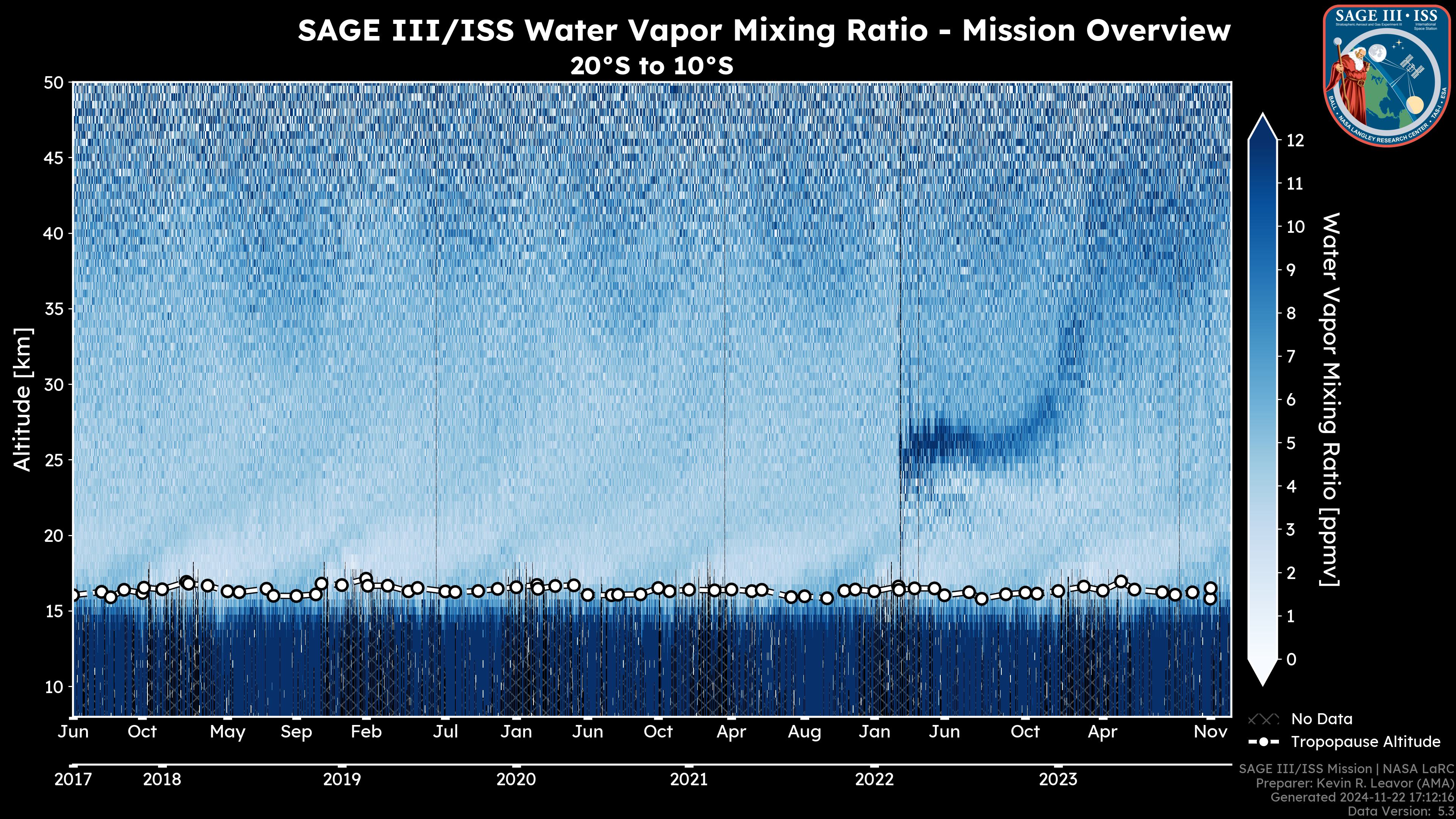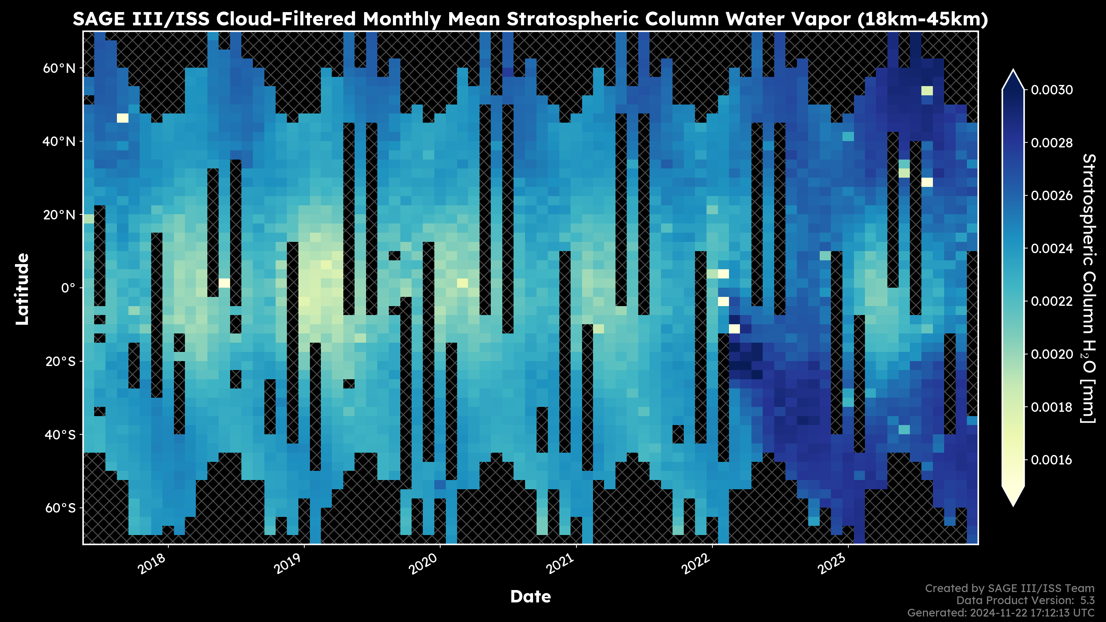 Figure 6 shows a snapshot mission overview plot of SAGE III/ISS measured water vapor mixing ratio from this site. The values of water vapor mixing ratio saturate the scale used on the plot in the month following the eruption, and elevated amounts of water vapor are visible up to 45 to 50 km for two years following the eruption through 2023. In aggregate analyses, such as the monthly zonal mean imagery on this site, the elevation over background at higher altitudes is still visible into 2024.