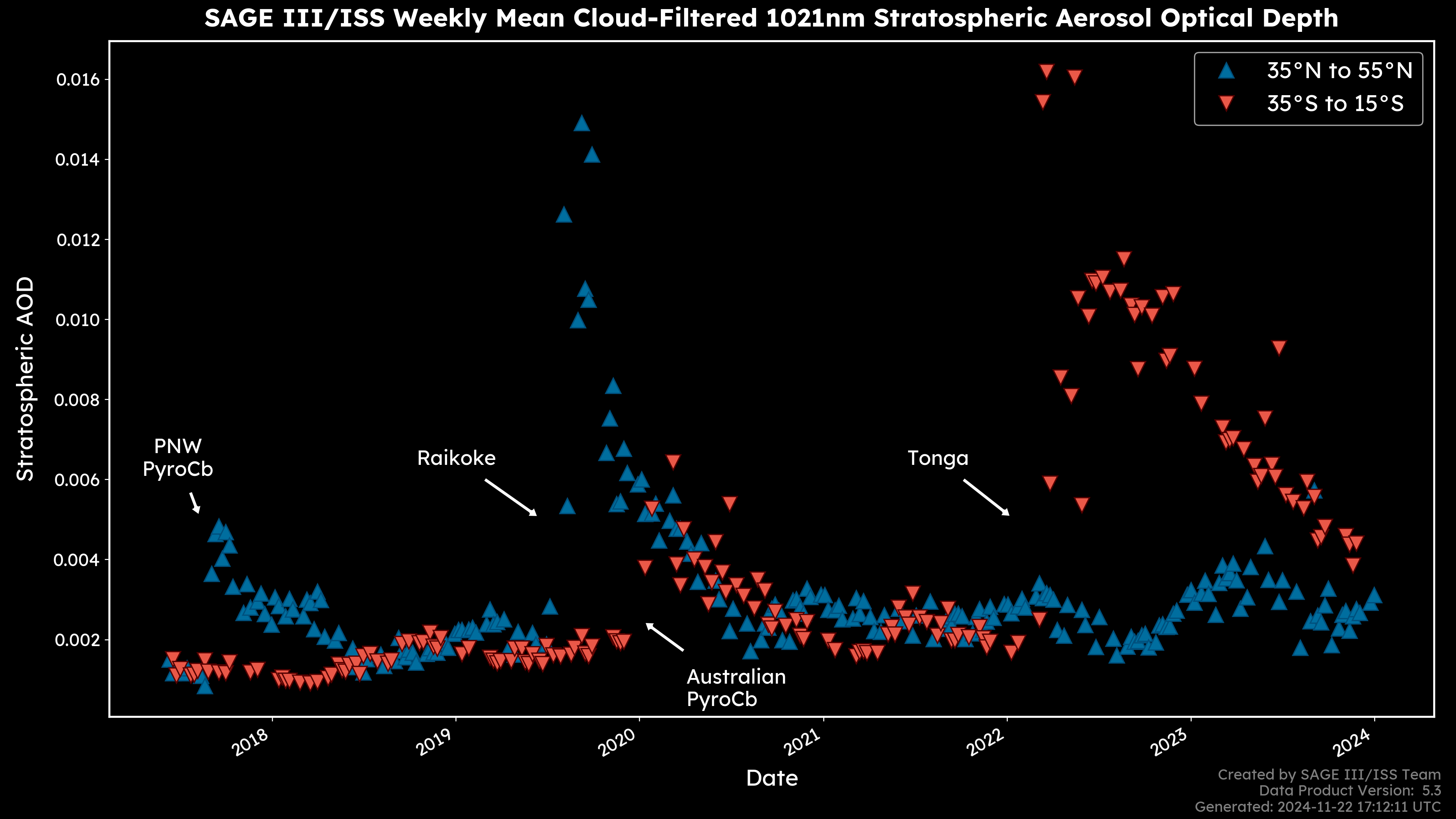 Despite the low amounts of SO2 injected into the stratosphere, the impact to aerosol composition in the stratosphere from HTHH has been pronounced. The unprecedented increase in water vapor provided an additional pathway to convert SO2 into sulfuric acid particles (Zhu et al., 2022). Measurements of Stratospheric Aerosol Optical Depth (SAOD) illustrate the impacts of major events on total stratospheric aerosol burden in both spatial and temporal extents. Figure 3 shows SAGE III/ISS measurements of SAOD averaged monthly and zonally (in latitude). SAGE III/ISS had measured events including volcanic eruptions - such as the eruptions of Ambae in 2018, Raikoke in 2019, and Ulawun in 2019 - and pyrocumulonimbus (PyroCb) events from wildfires in the Pacific Northwest (PNW) in 2017 and Australia in 2020. However, the geographic extent and longevity of the produced aerosol are significantly pronounced in the SAGE III/ISS record of global SAOD. Figure 4 shows a more granular view, focusing in on latitudes with repeated aerosol perturbations in the Northern Hemisphere (upward pointing blue triangles) and Southern Hemisphere (downward pointing red triangles). In this view, the large perturbation of SAOD from HTHH is less dramatic and on par with the Raikoke eruption in the Northern Hemisphere from 2019. However, the longevity is clearly apparent, with SAOD values exceeding the peaks of the large pyrocb events for the entirety of the following year.